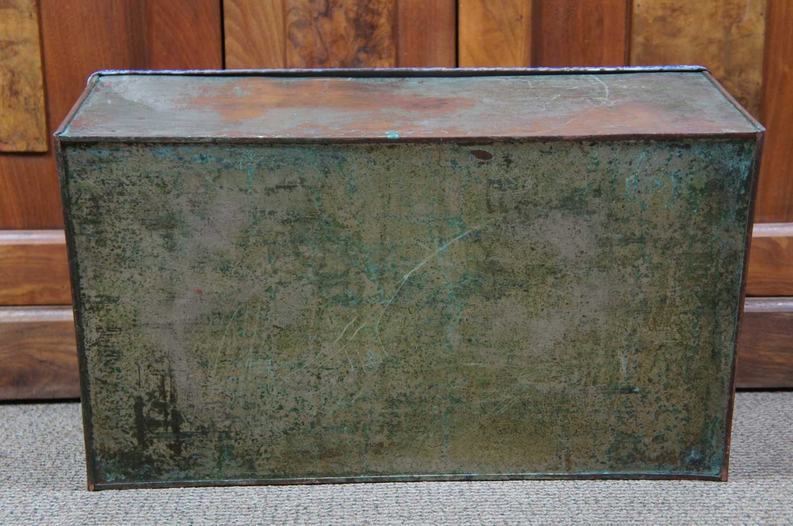 Very Good - Tarnish/oxidation to base; some spots of rust/chipped edges to lid; couple small dents in sides; see pictures