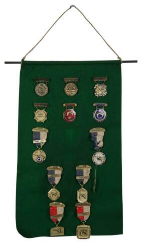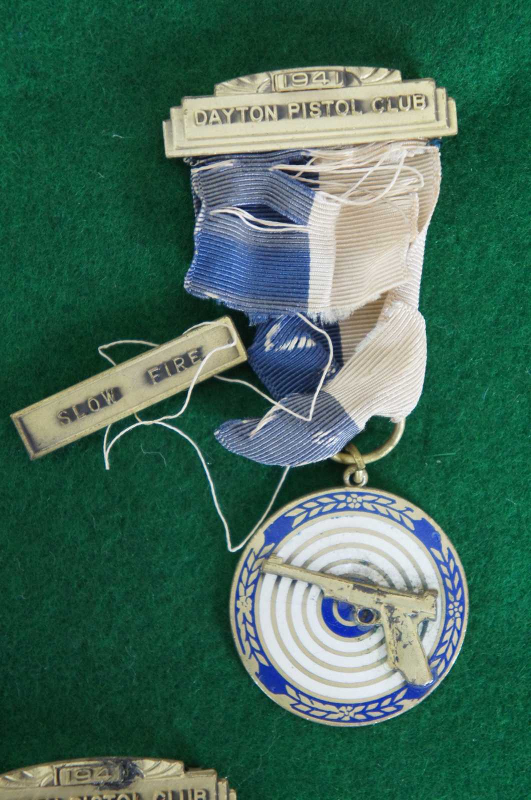 Set of 12 National Rifle Association of America and Dayton Pistol Club marksman and sharpshooting medals from the 1940’s displayed on a simple green baize banner.