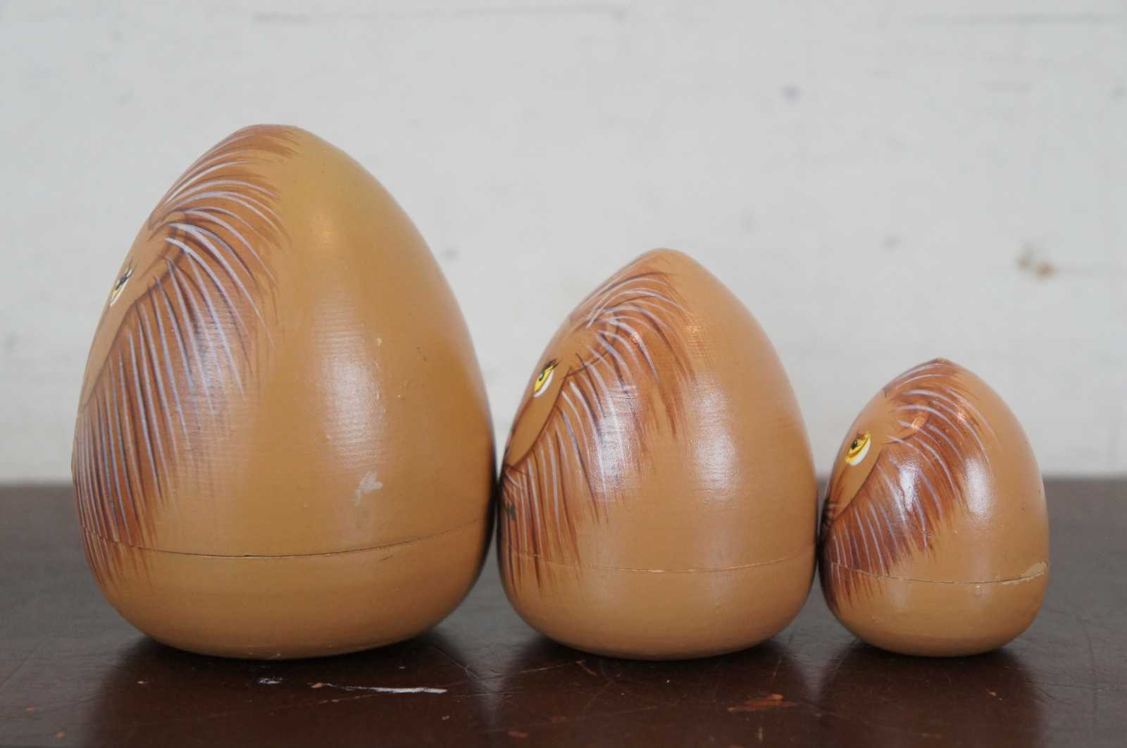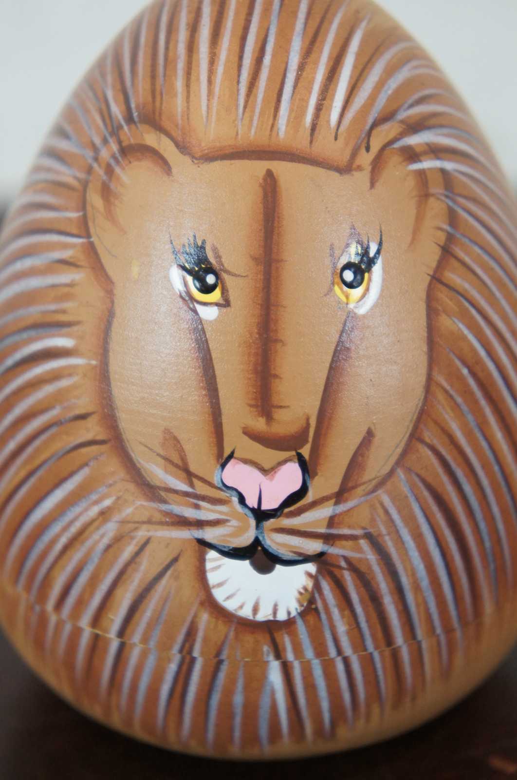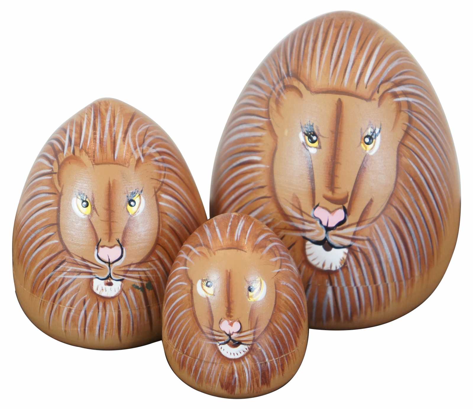 Vintage three piece hand painted folk art egg shaped Russian Matryoshka lion nesting dolls. Features the King of the Jungle, with his lioness and cub.