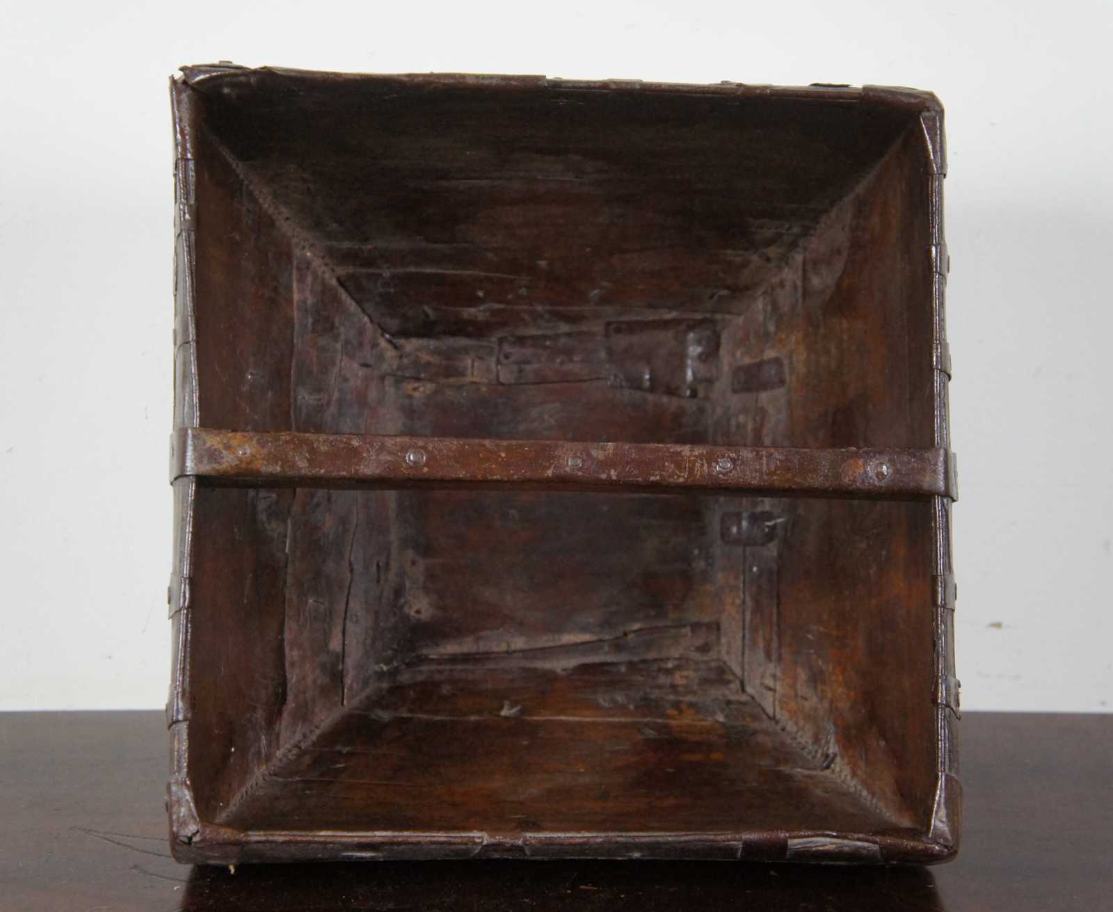 Antique wooden grain or rice measure / harvesting bucket with handle across the middle and primitive iron accents.