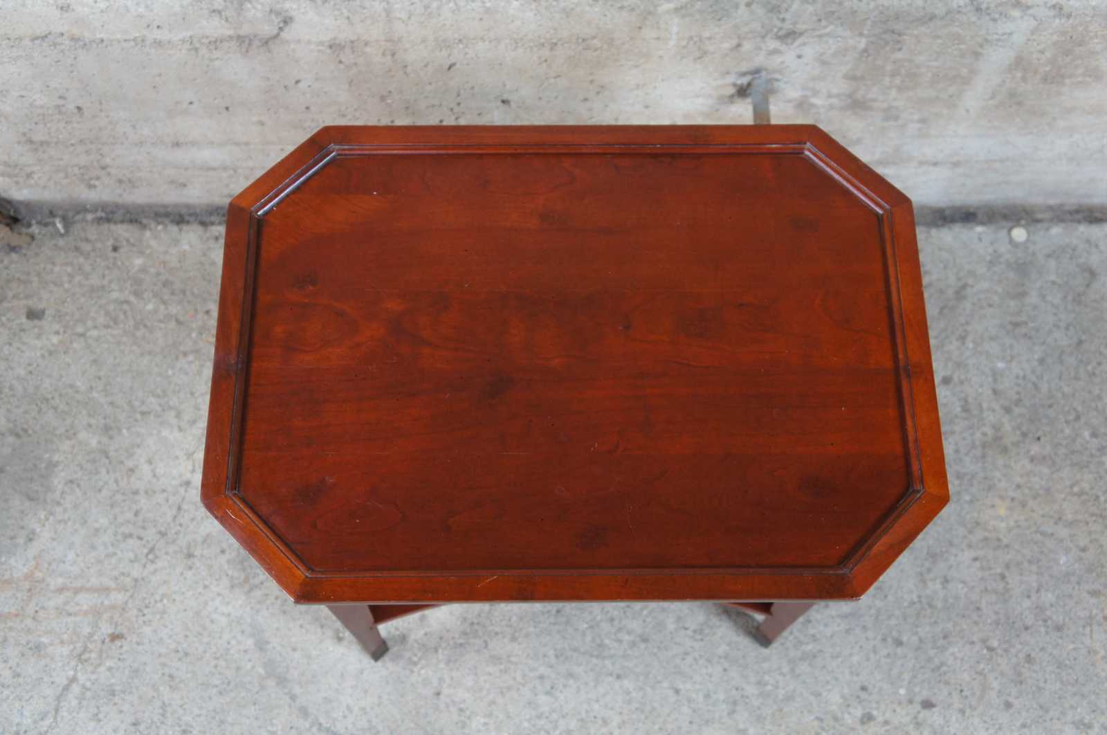 Bombay Company egyptian revival end table. Made from cherry with an octagon shape inset top and beeded trim. The table is supported by square tapered legs topped with glowing figural brass caryatid mounts. Legs terminate into brass capped feet.
