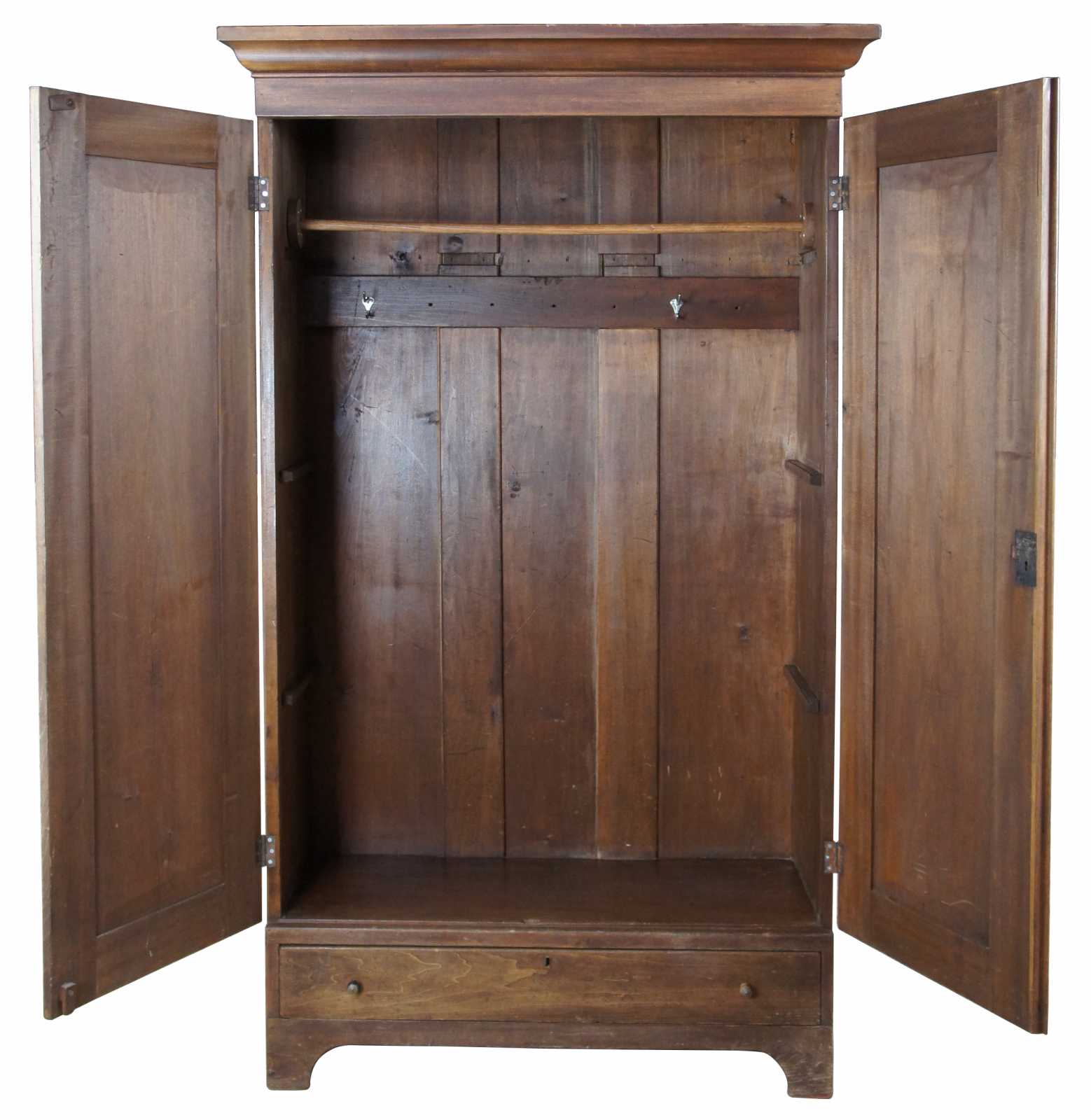 Primitive Early American farmhouse style clothing armoire. Made of walnut, featuring a hanging bar and one central lower drawer. Circa 1870s.
