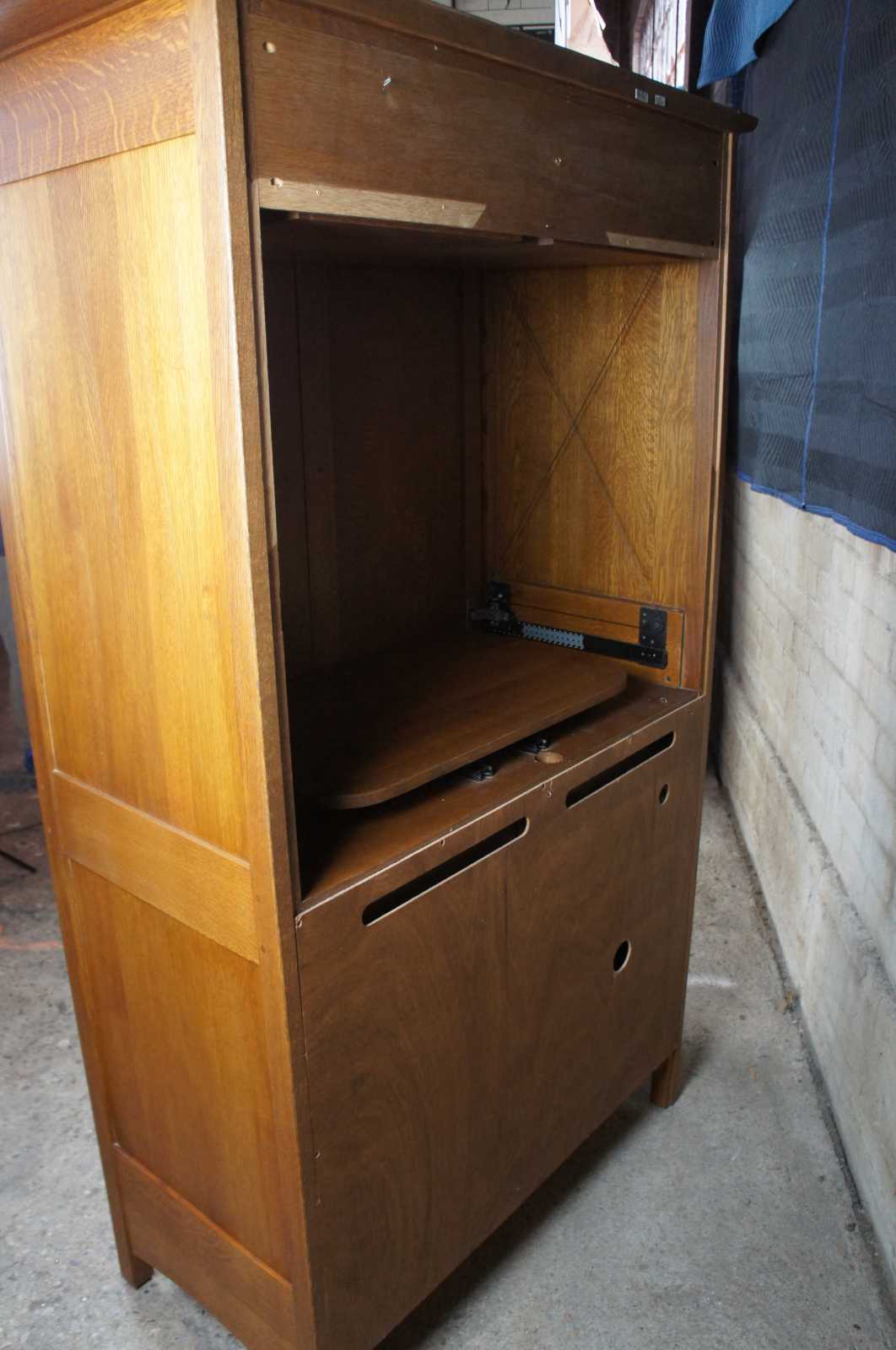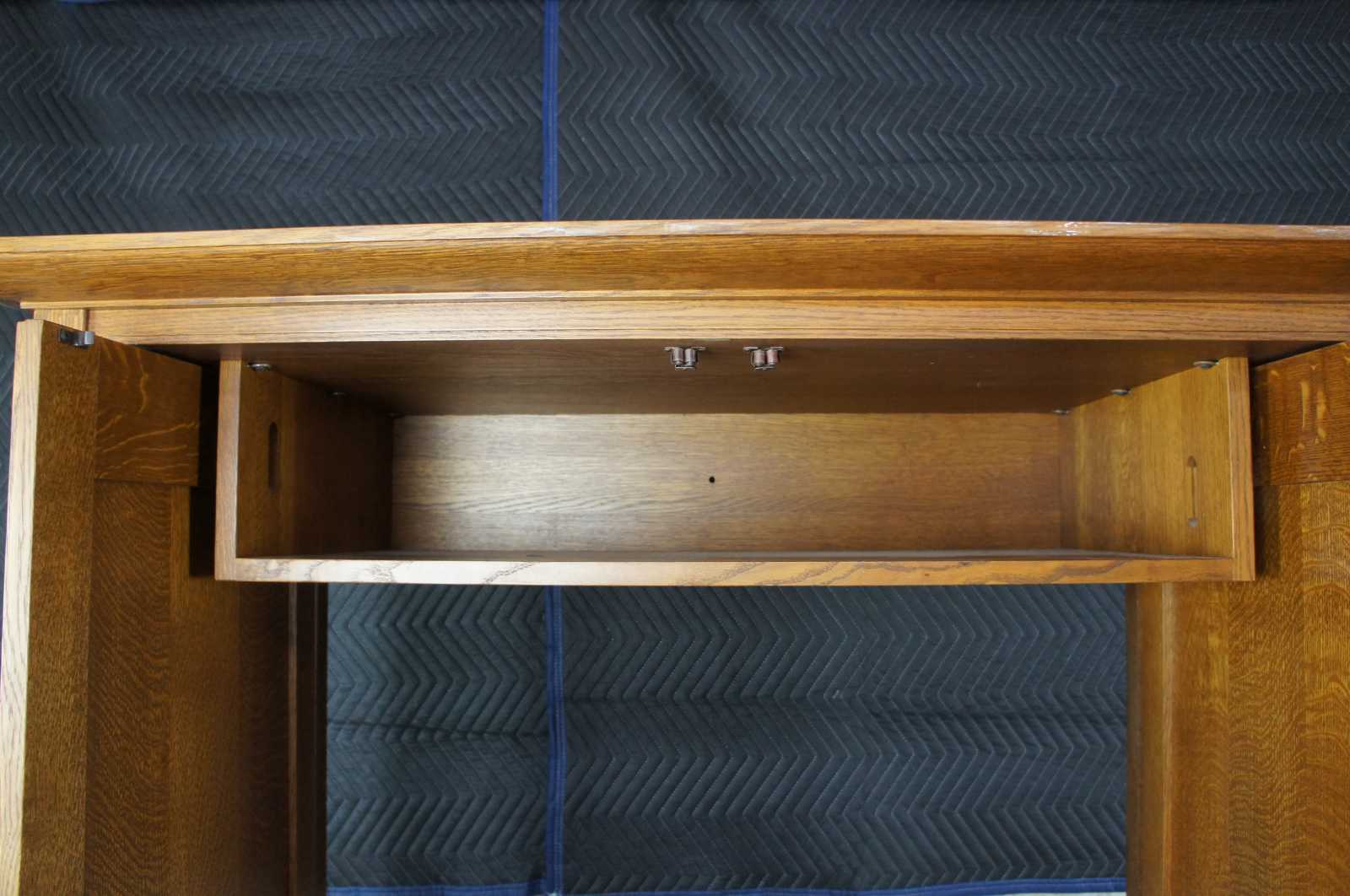 Late 20th Century Stickley media cabinet or armoire. Made from quartersawn oak in classic mission design with hammered copper hardware, bowtie inlay and 2 fitted interior drawers.