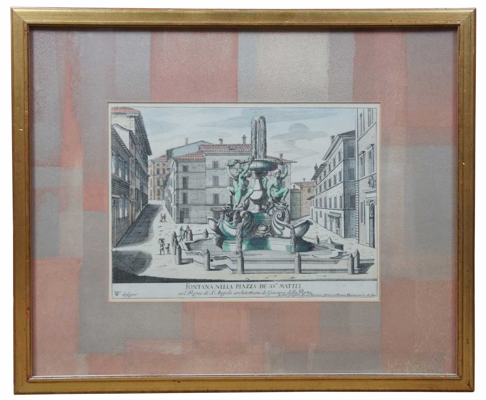 Set of two antique colored engravings featuring some of the Splendors of Rome – One city street featuring the Church of Saint Andrea and one showing The Turtle Fountain in the Piazza Mattei.