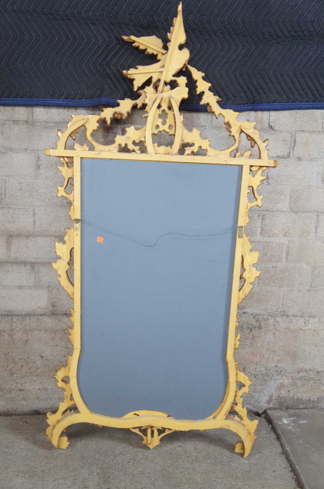 Vintage circa 1980s Baroque / Rococo / Chinese Chippendale inspired wall mirror by Carvers Guild. Made of wood, painted with antique gold leaf finish. Features ornate scalloped Italian design with florals, a wreath and dove / bird topper.