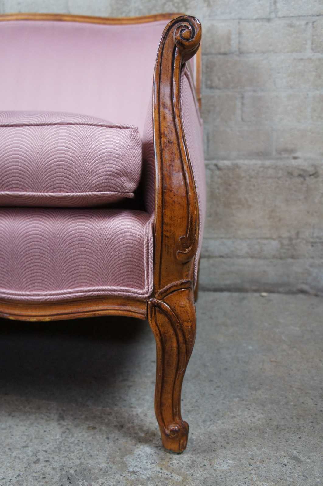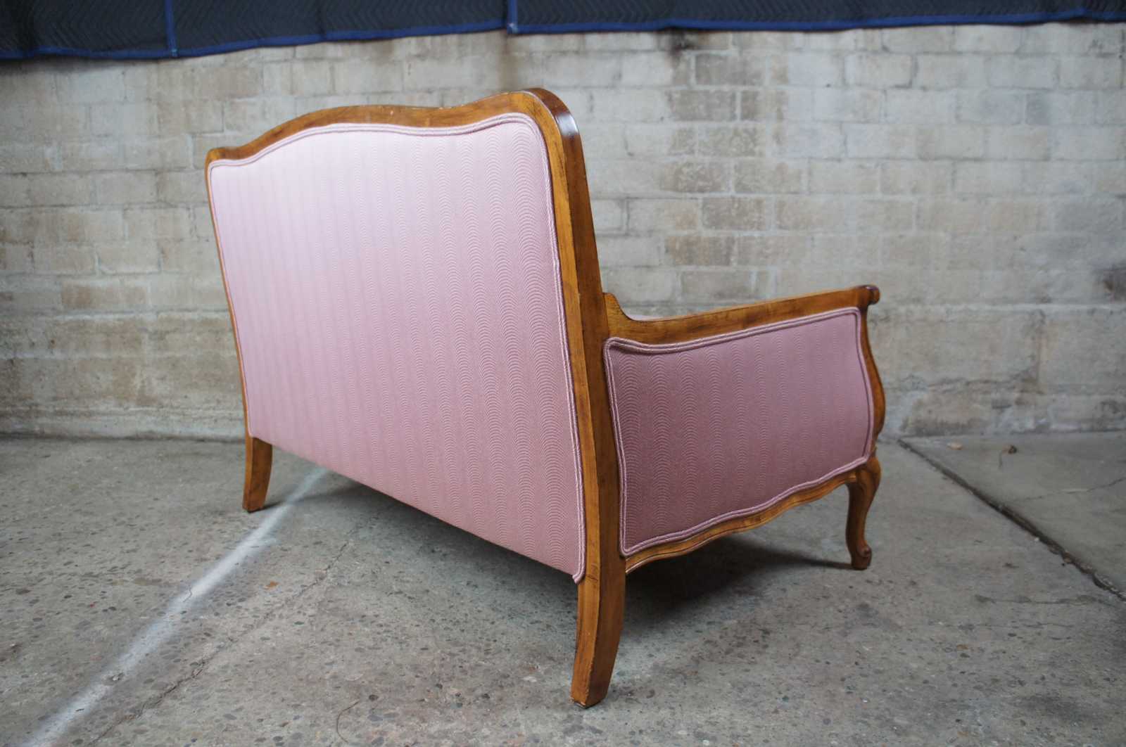20th Century Country French camelback settee. Made from walnut scrolled and flared arms. Upholstered in pink.