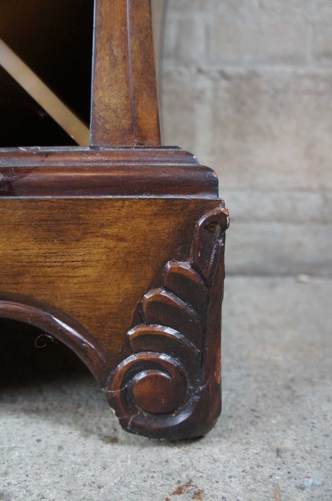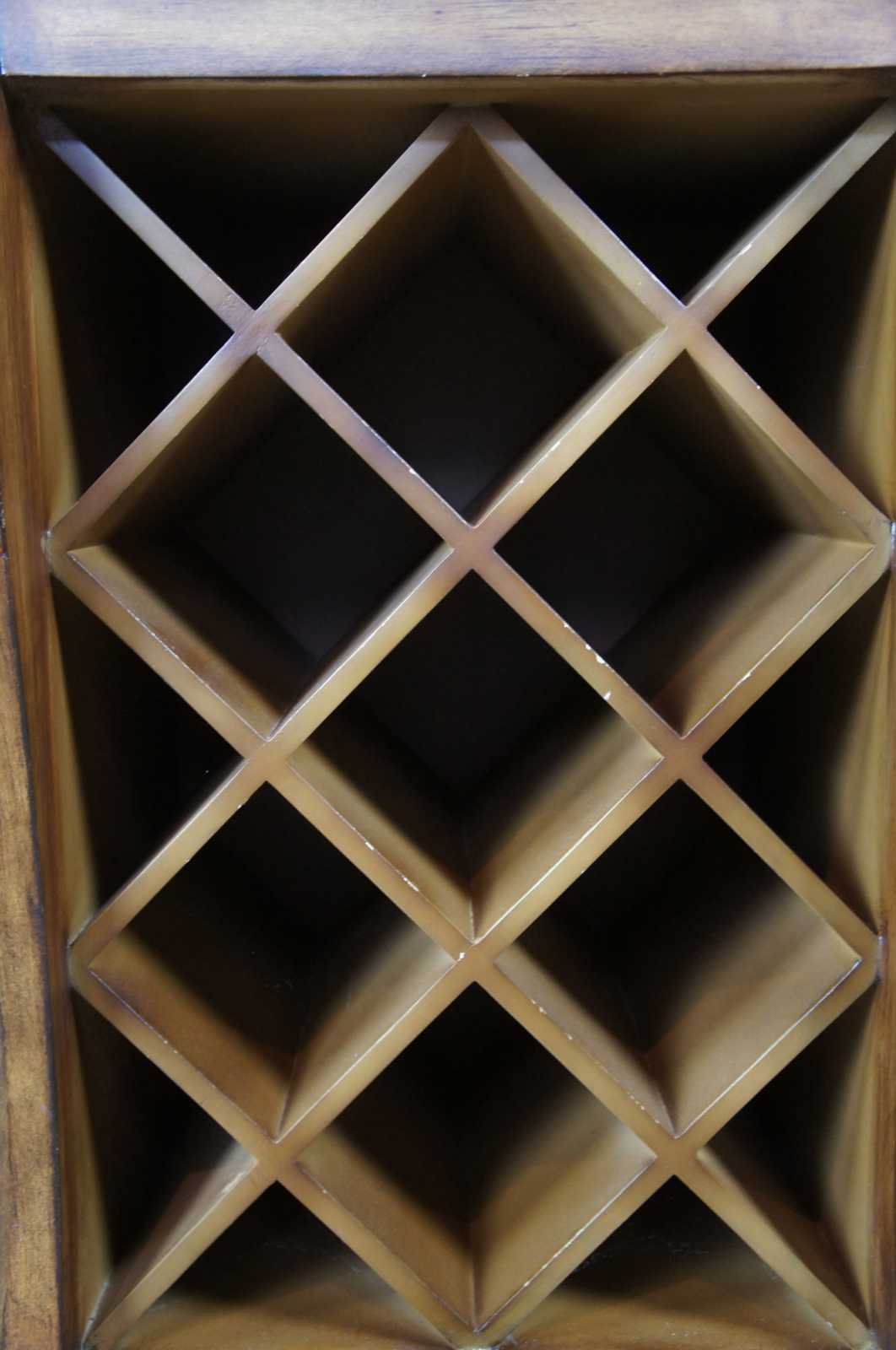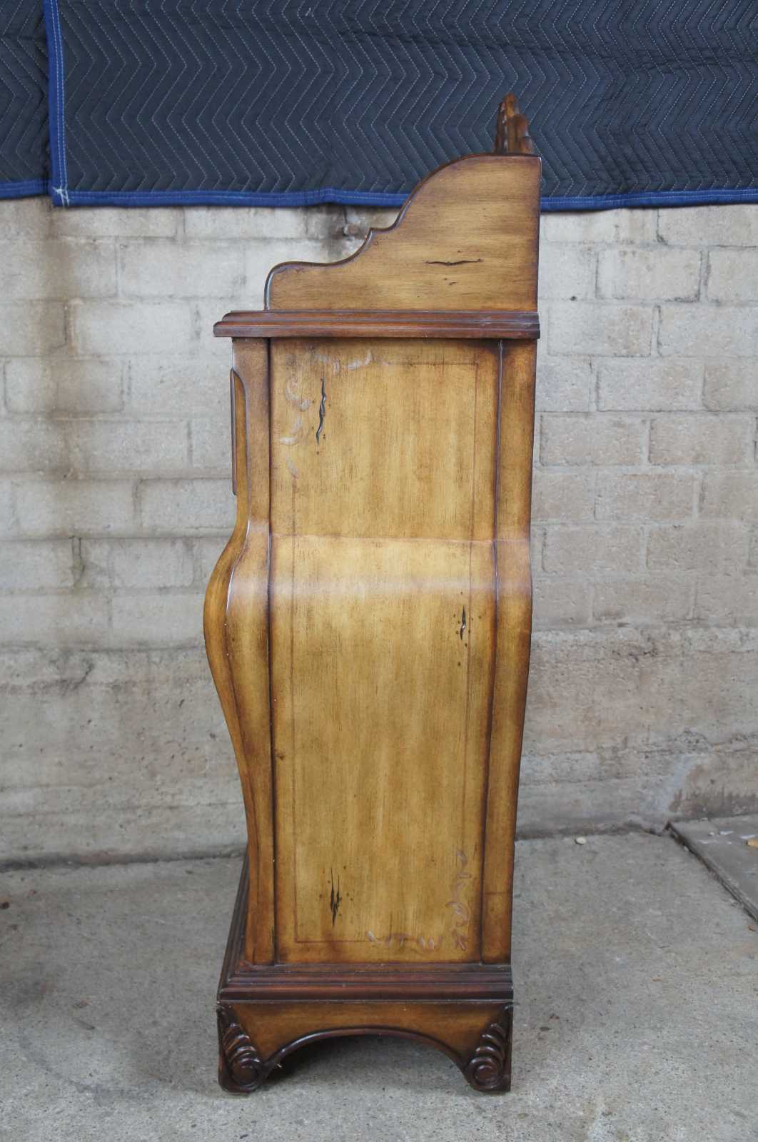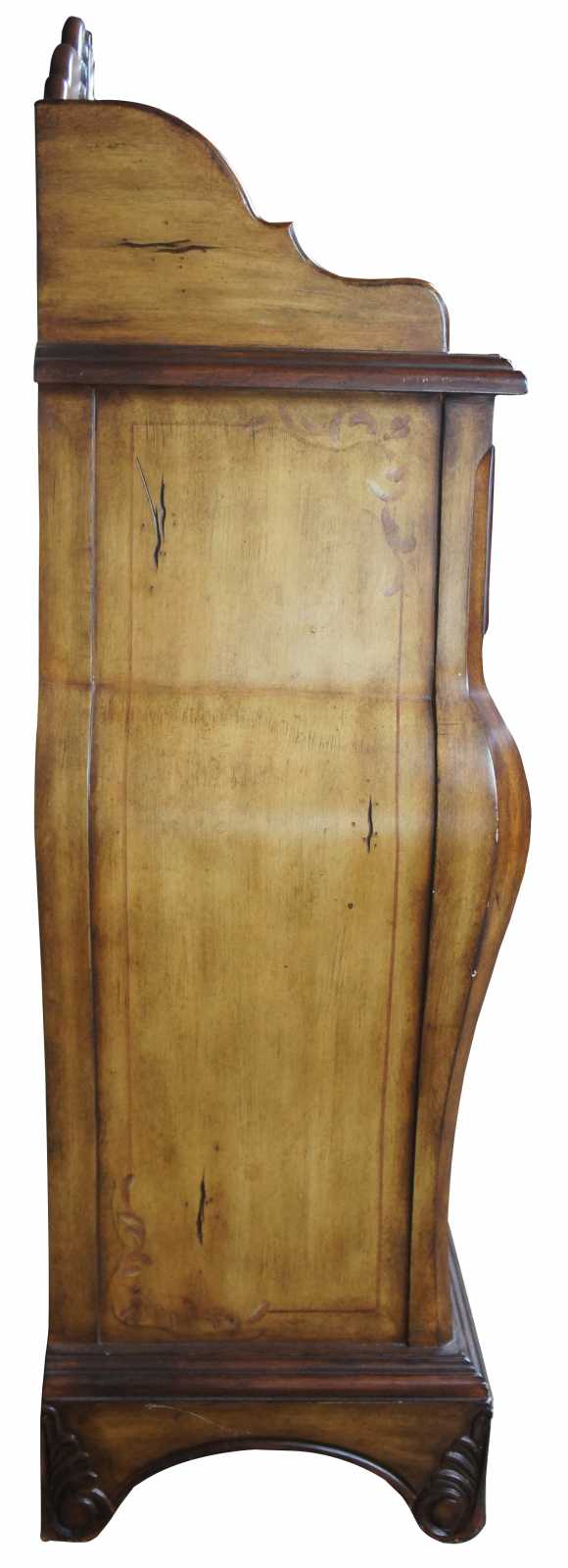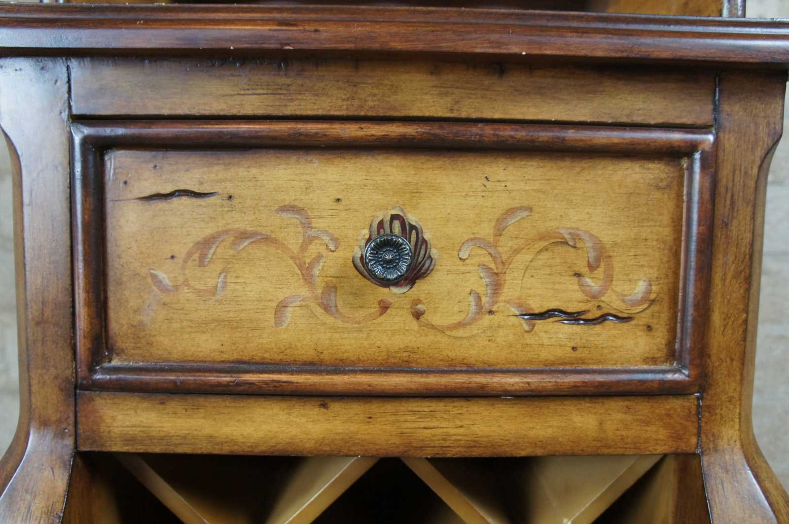 Vintage French Country wine rack. Features hand painted florentine design with bombe or sepentine shaping with a cartouche shell backsplash. One drawer for storage.