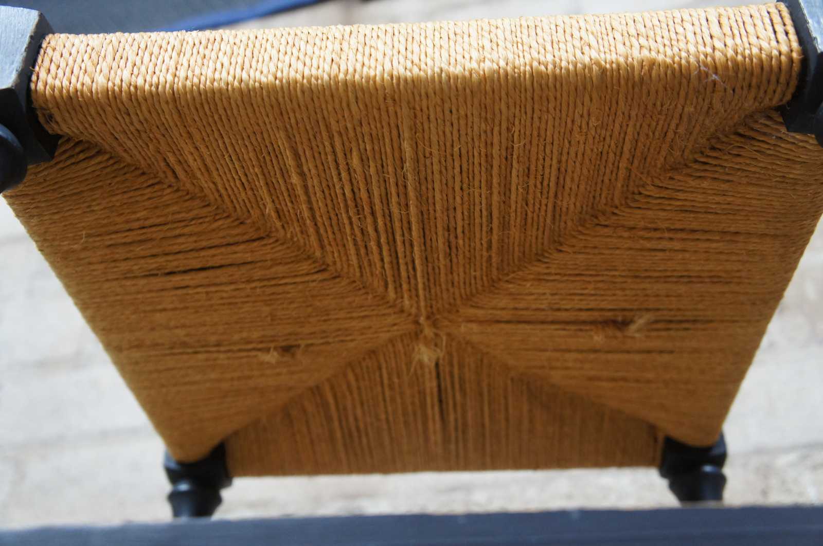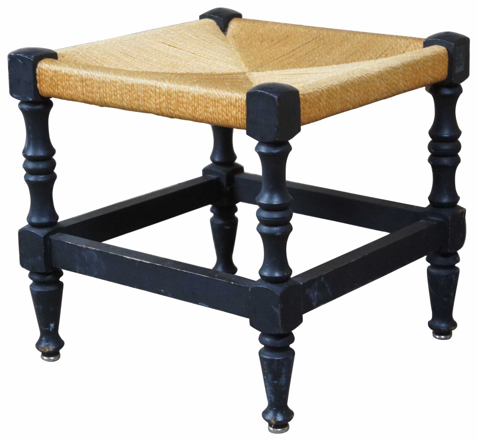Vintage Shaker style stool or foot rest. Features woven seat, black painted finish with turned baluster supports and metal capped feet.