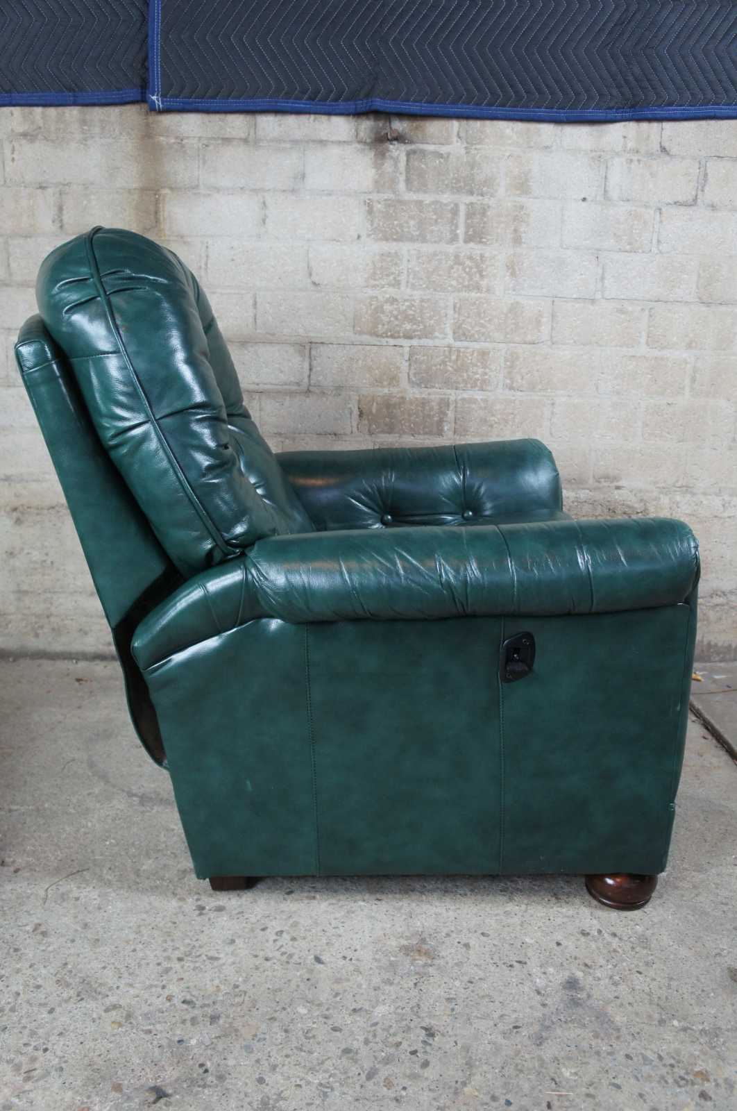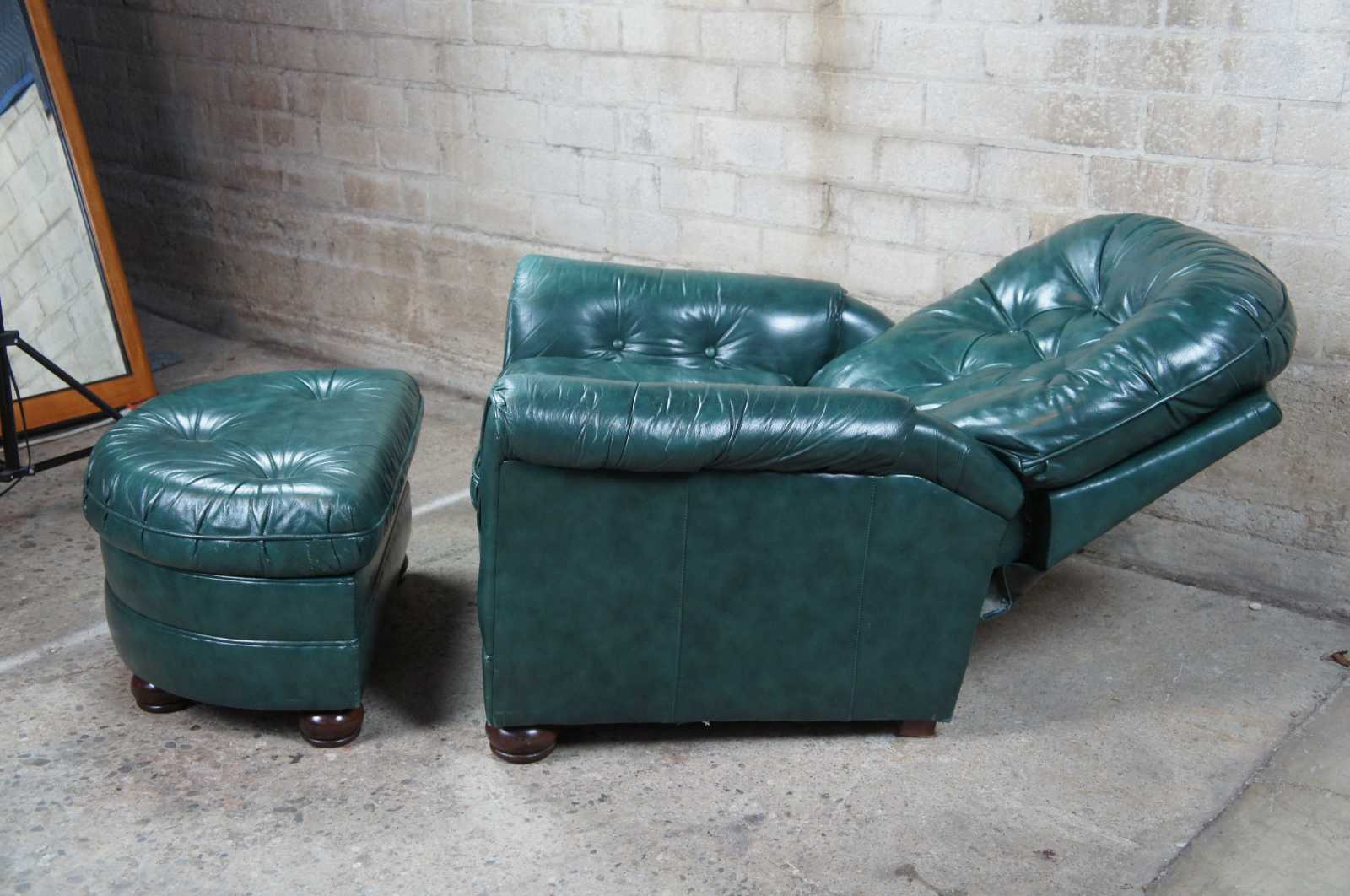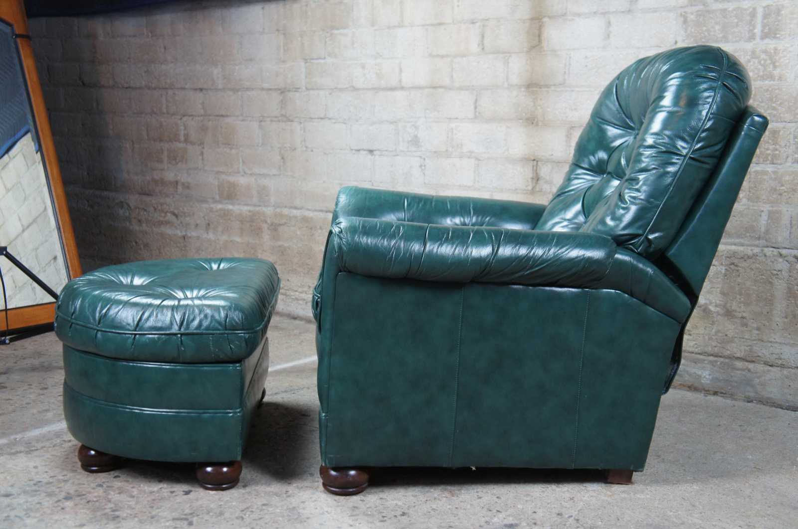 Vintage green leather Rockwell Recliner by Bradington Young. This set includes an armchair with curved crest rail and padded, button-tufted back joining flared armrests. The chair includes a removable seat cushion over a front apron terminating on rounded wooden feet. Also includes a demilune shaped ottoman.