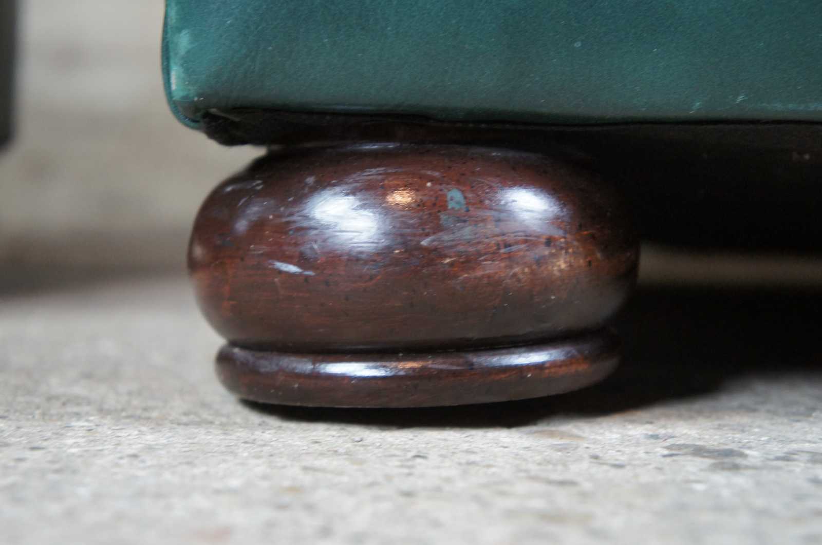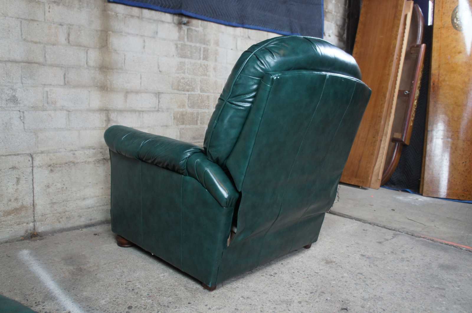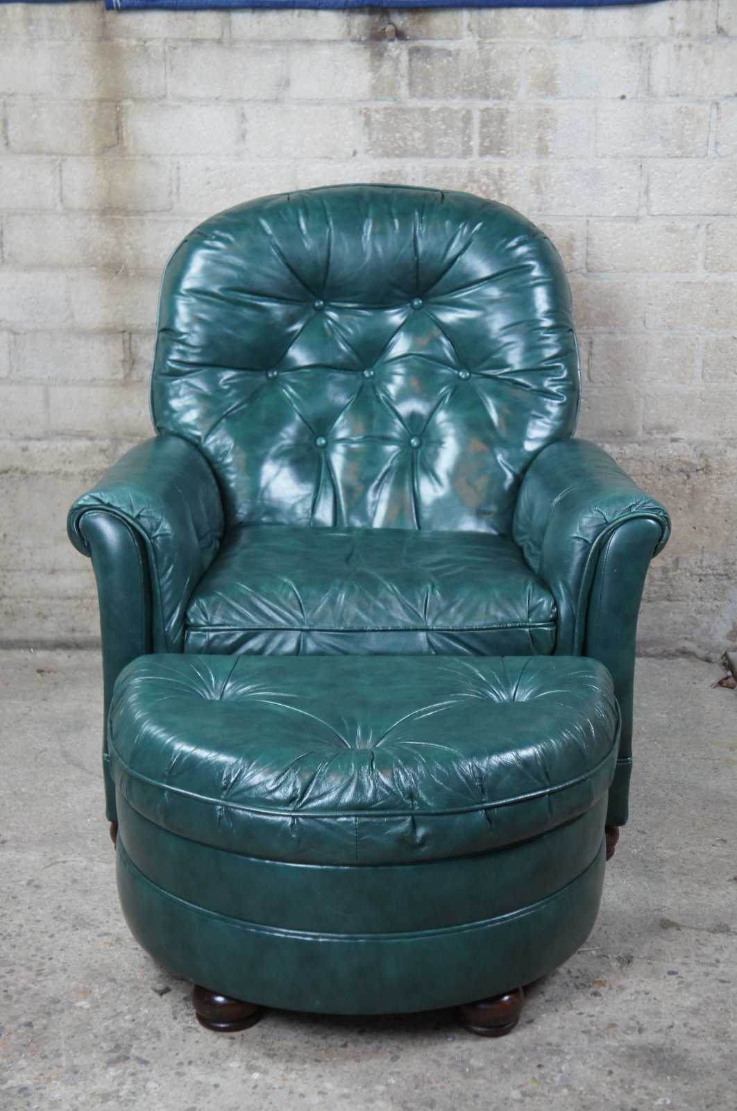 Vintage green leather Rockwell Recliner by Bradington Young. This set includes an armchair with curved crest rail and padded, button-tufted back joining flared armrests. The chair includes a removable seat cushion over a front apron terminating on rounded wooden feet. Also includes a demilune shaped ottoman.