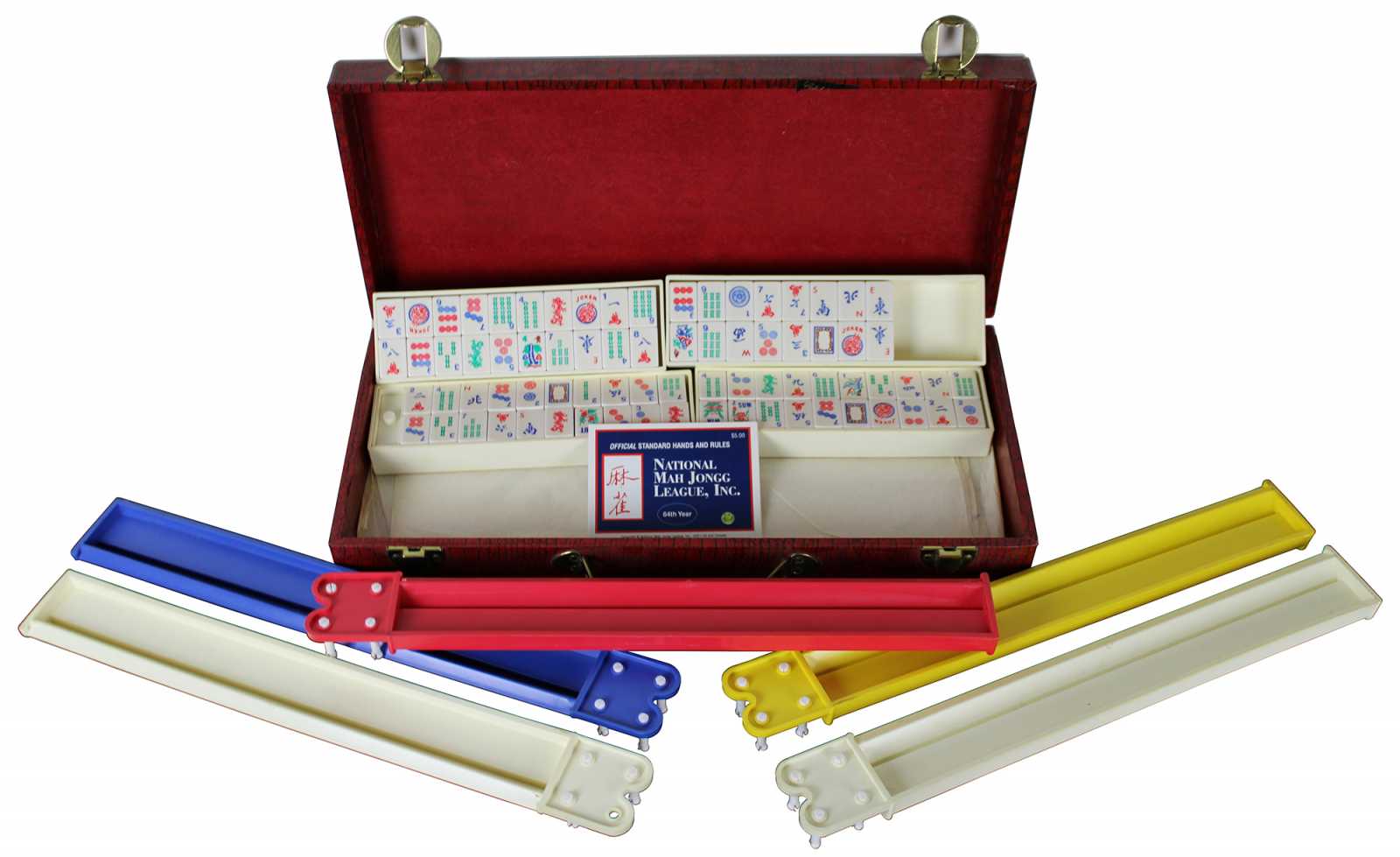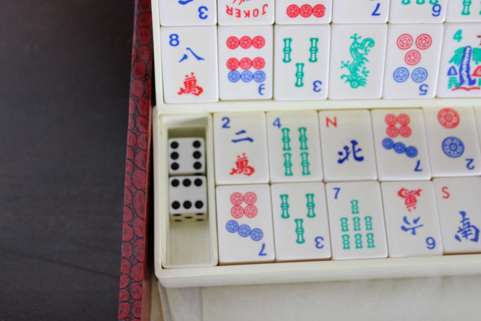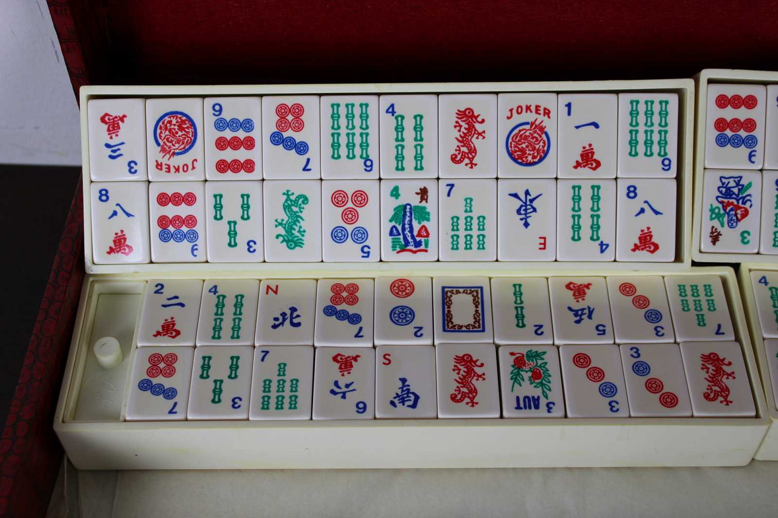 Vintage Chinese Mahjong set featuring 152 tiles, 5 racks and red leather carry case. The tiles are a white or cream with red, blue and green accents. Dragons, bamboo and calligraphy themed.