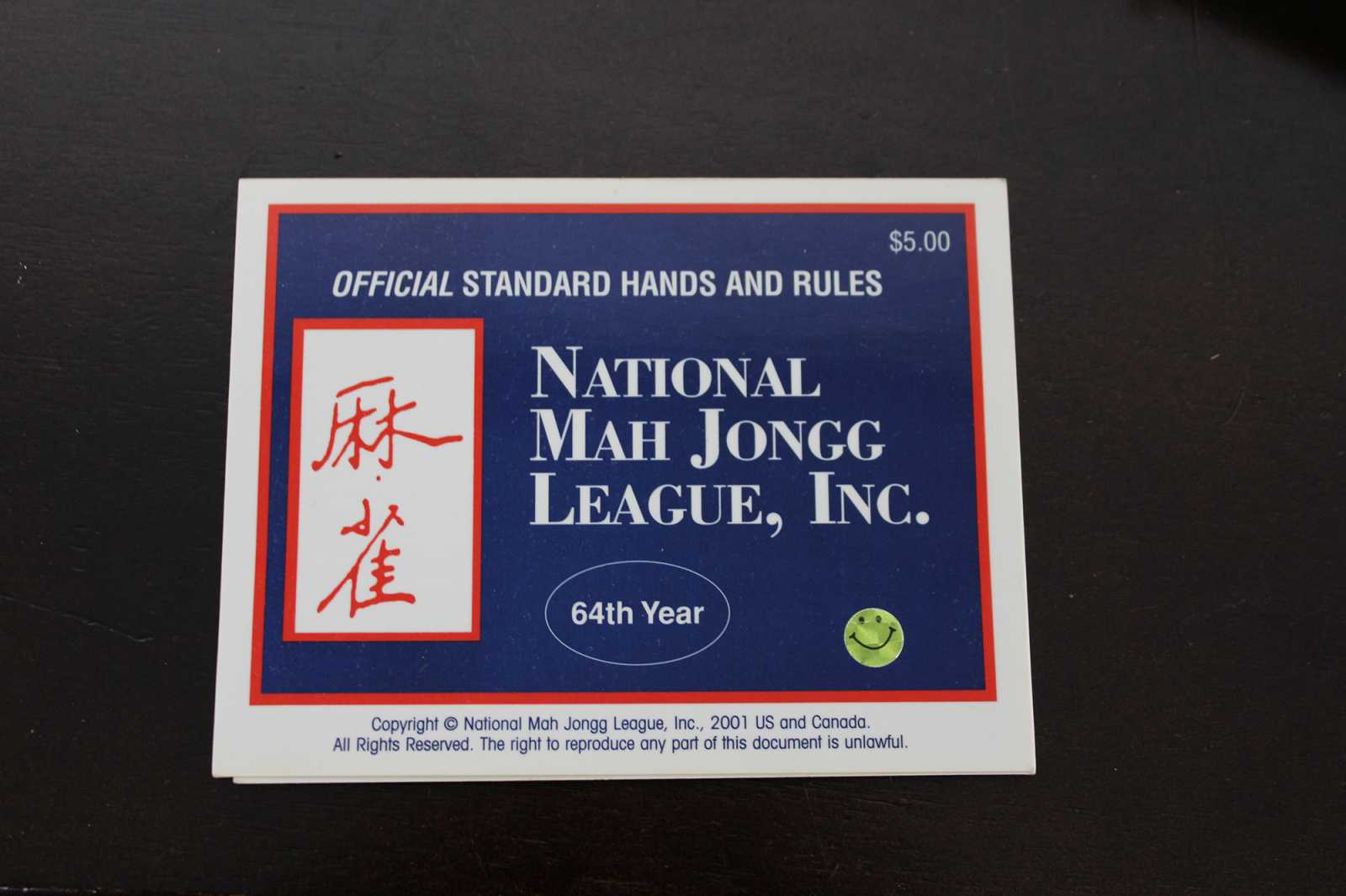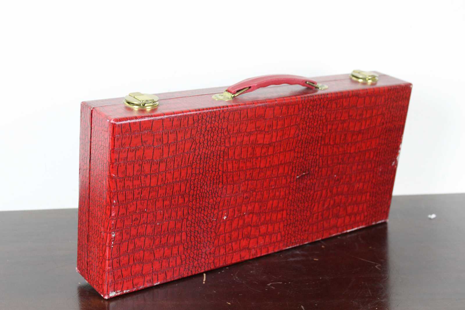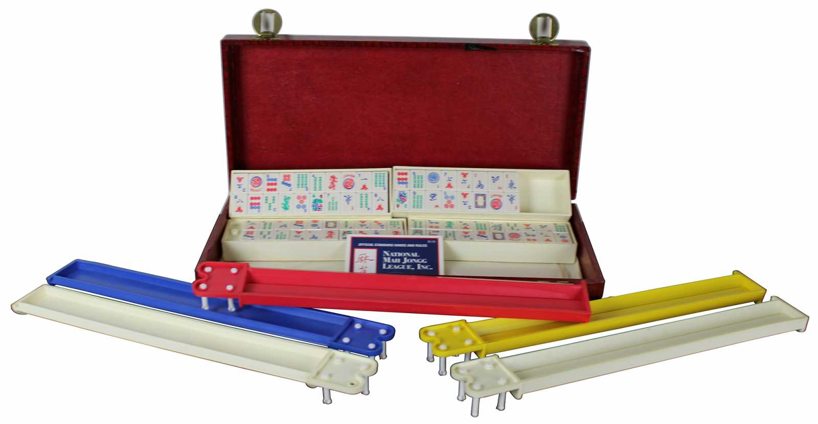 Vintage Chinese Mahjong set featuring 152 tiles, 5 racks and red leather carry case. The tiles are a white or cream with red, blue and green accents. Dragons, bamboo and calligraphy themed.