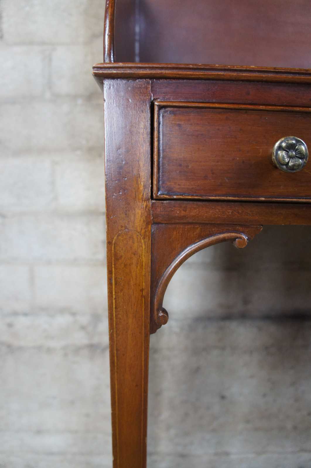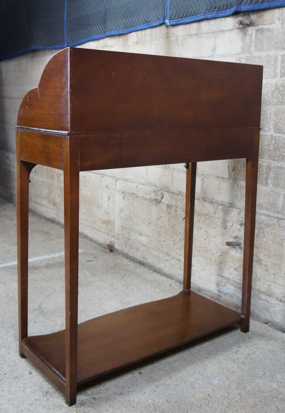 Mid 20th cenury mahogany washstand or server. Federal inspired with high dovetailed backsplash over two drawers and tapered and inlaid legs. Features a lower serpentine shelf.