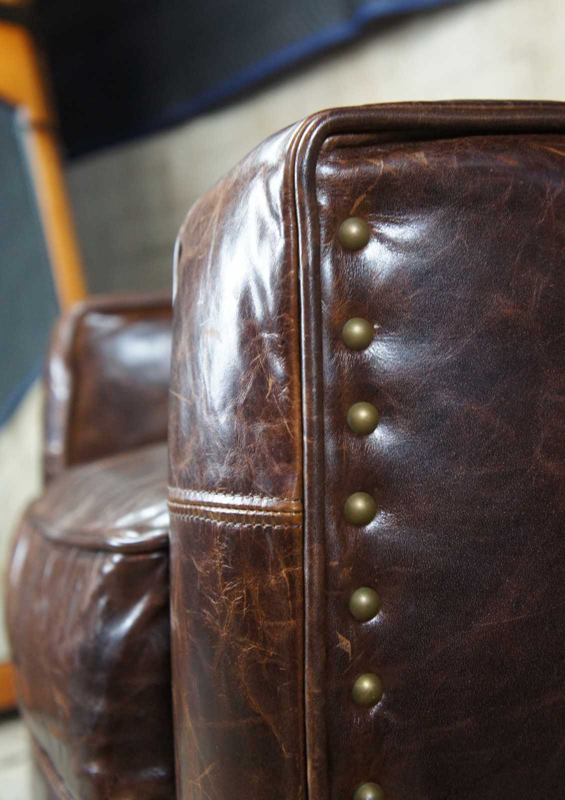 The “Library” chair is cocoa brown Italian Bromptom leather. The chair is sophisticated and masculine, a perfect accent for your family room. Modeled after reading chairs found in European libraries. The deep seat and broad arms with nailhead trim suit today’s standard for comfort.