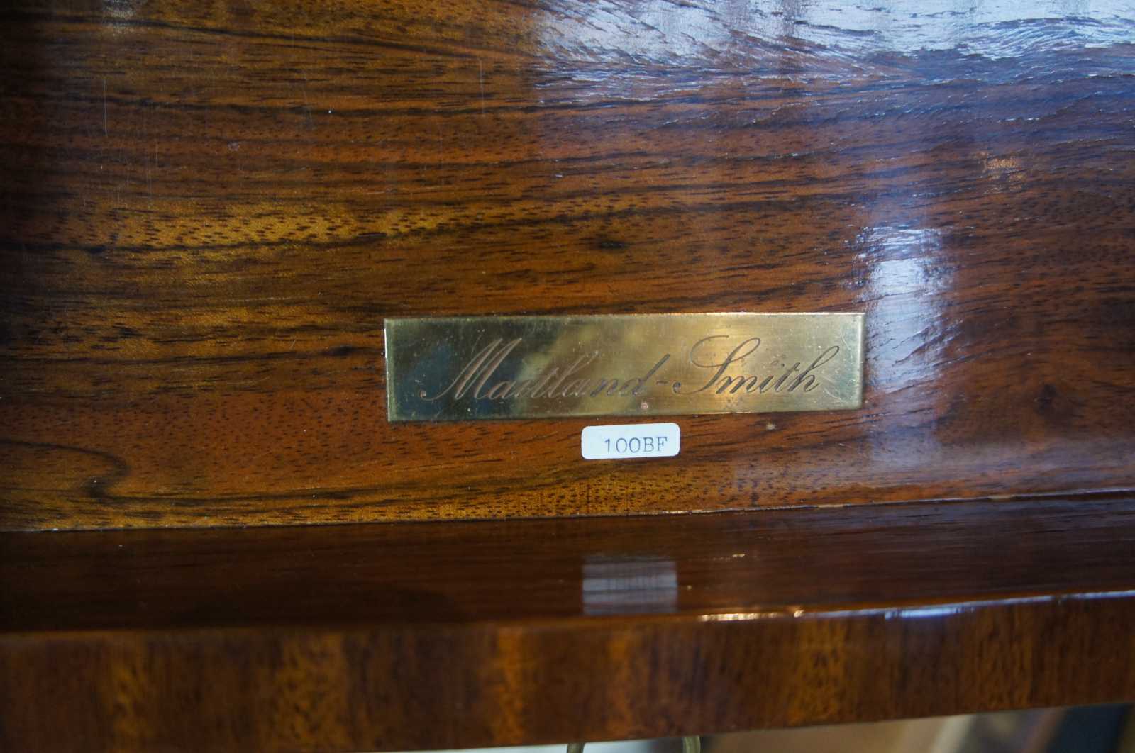 Iconic Maitland Smith William & Mary Style Highboy. Mahogany with herring-bone cross banding, two piece with upper having two over three graduated drawers, signed on inside of top center drawer, lower section with three drawers, brass knobs, baluster turned legs and scrolled stretcher base