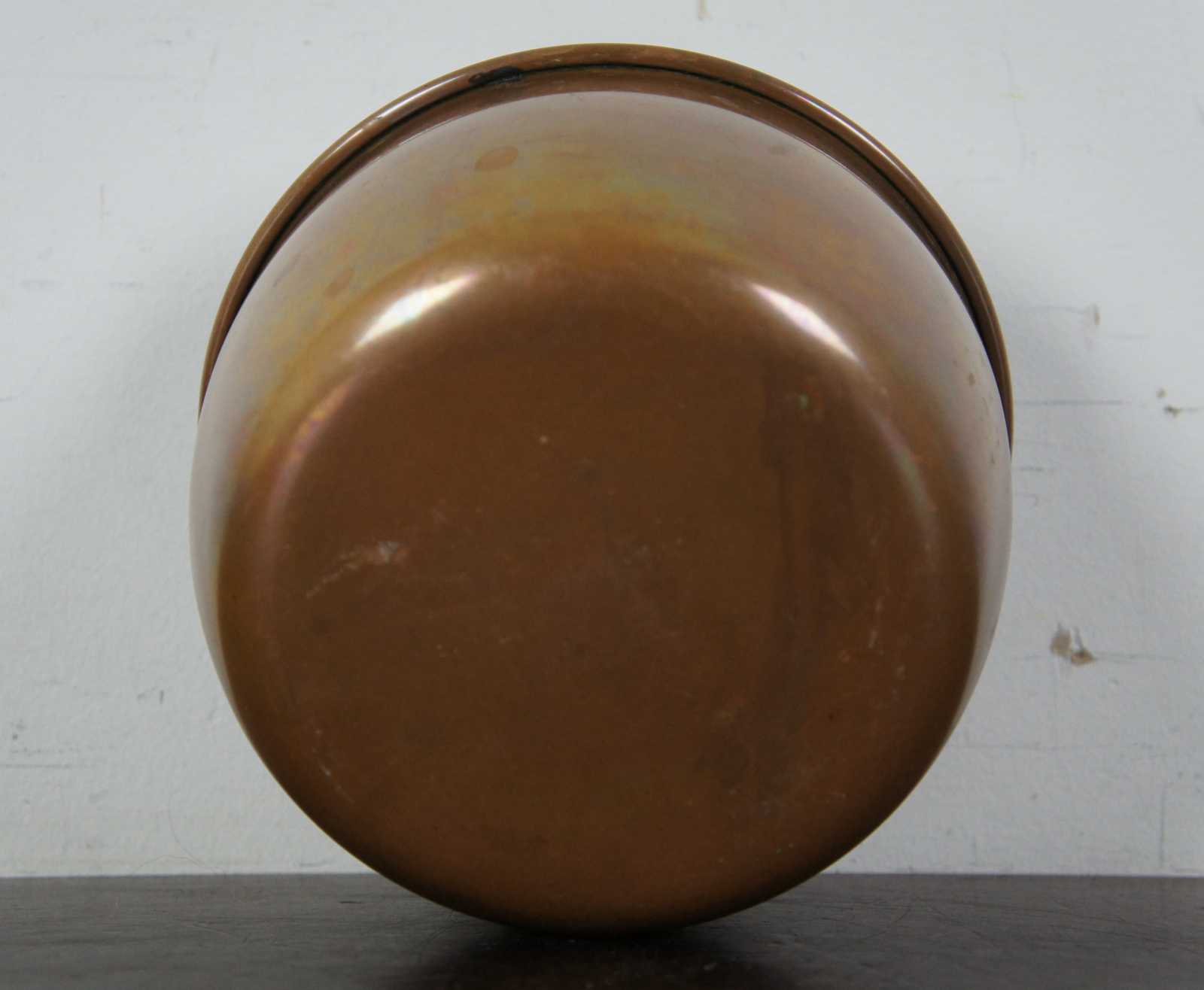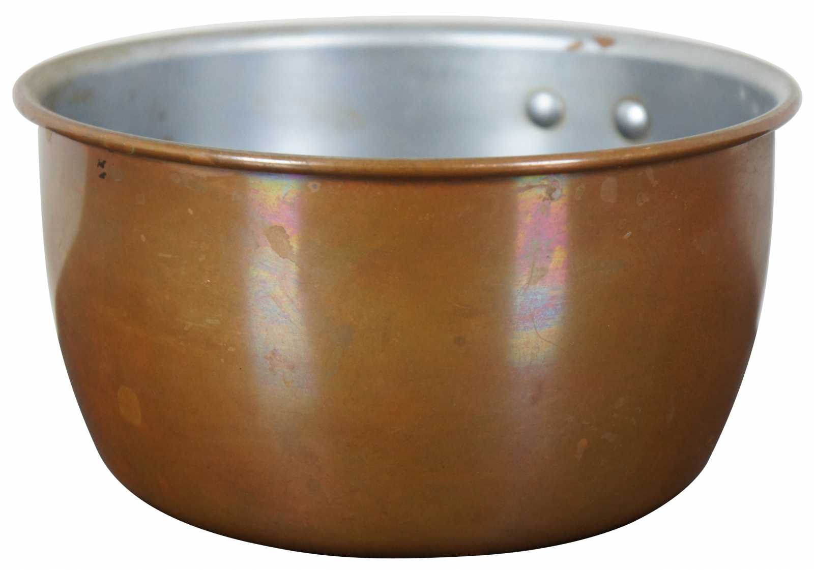 Vintage Revere metal ware copper pot with brass ring on one side for hanging and no handles.