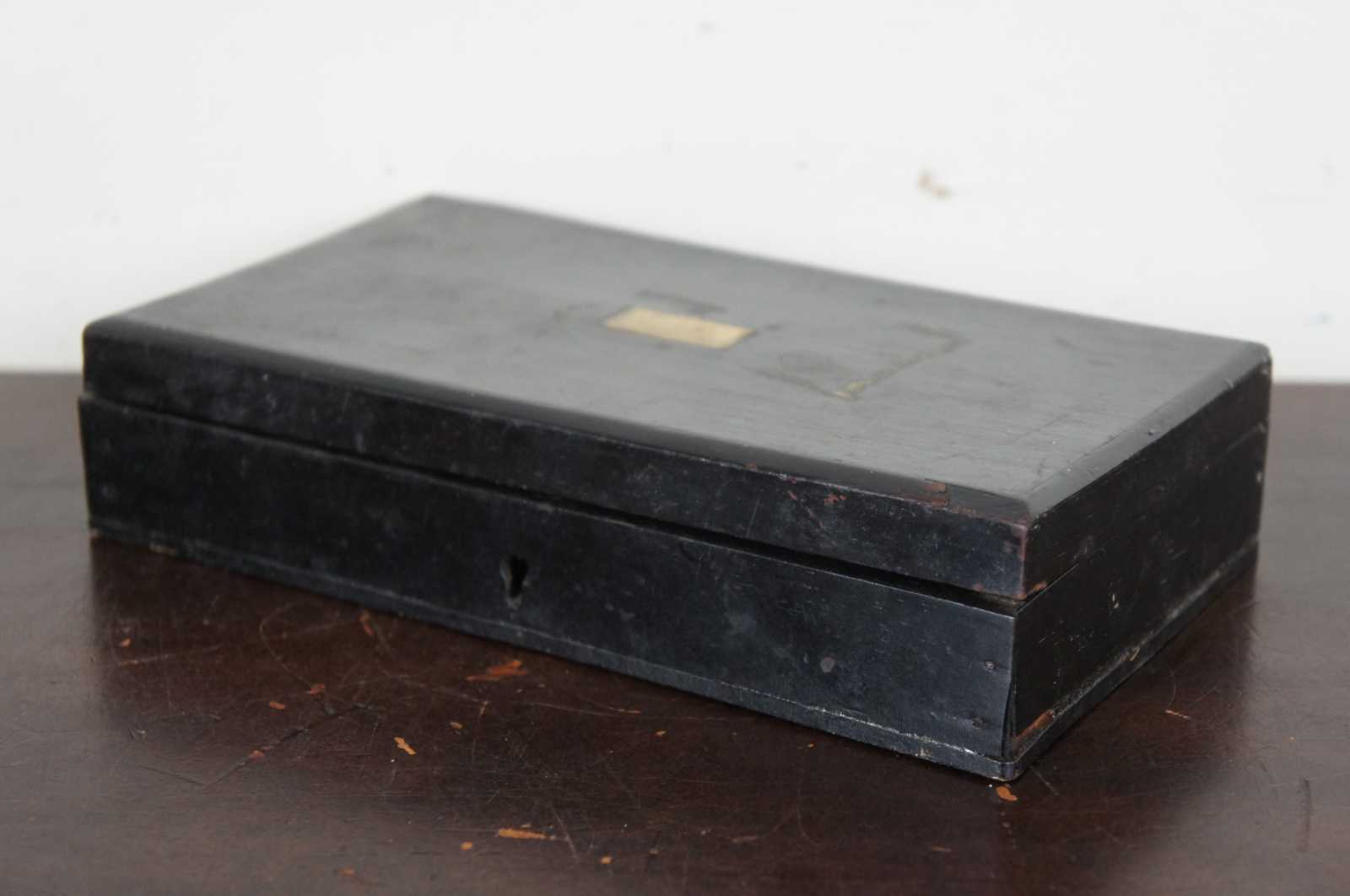 Antique wooden checkers with crowns in a black lacquer box.