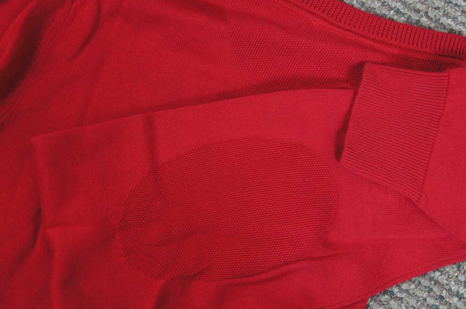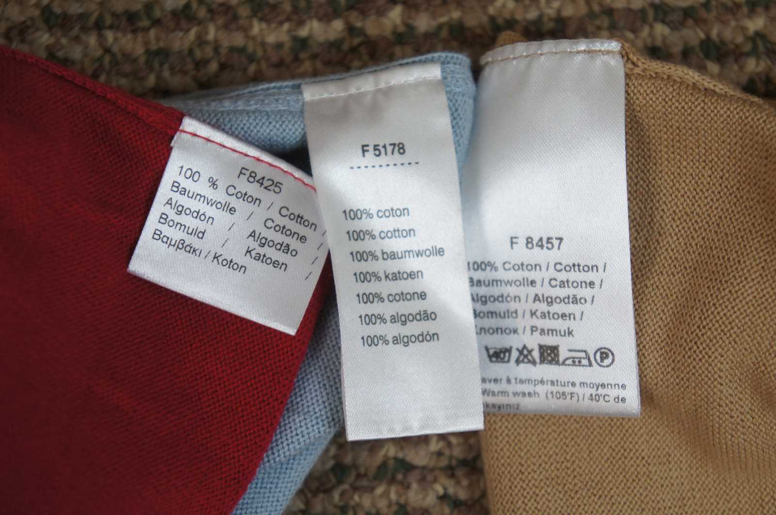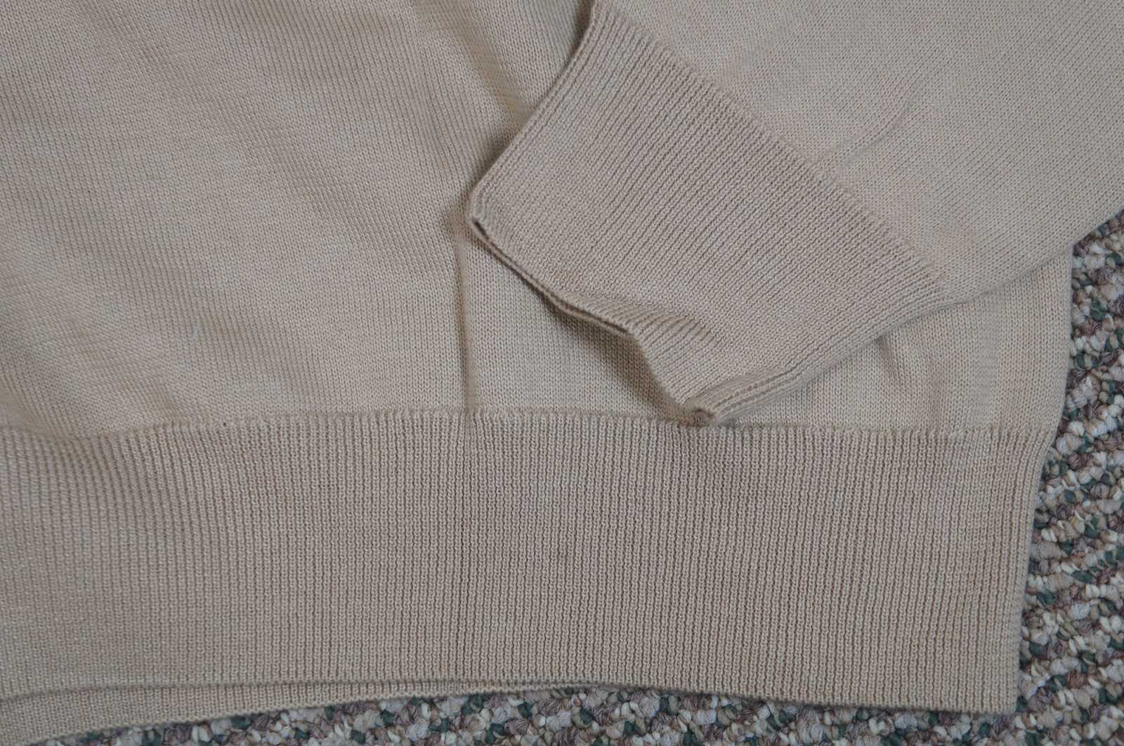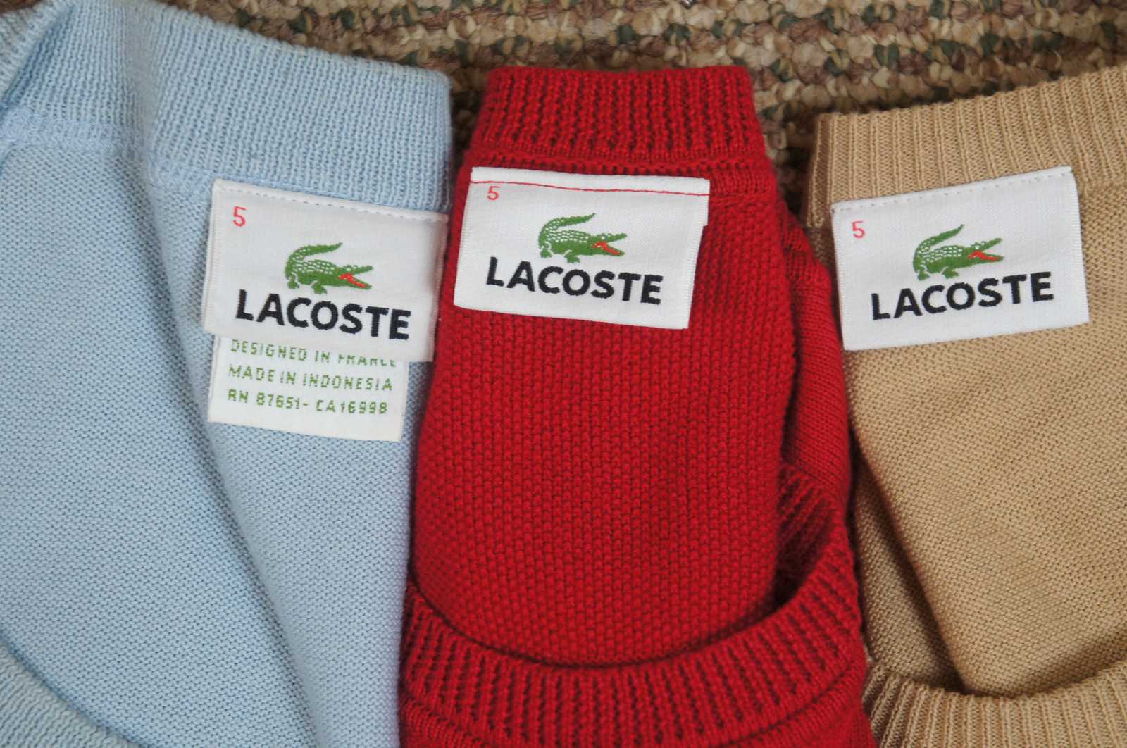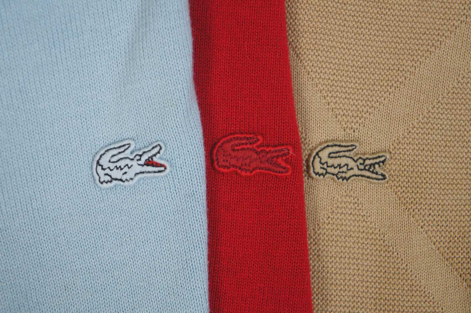 Tan, powder blue and red Lacoste men’s long sleeve, crew neck pull over sweaters.