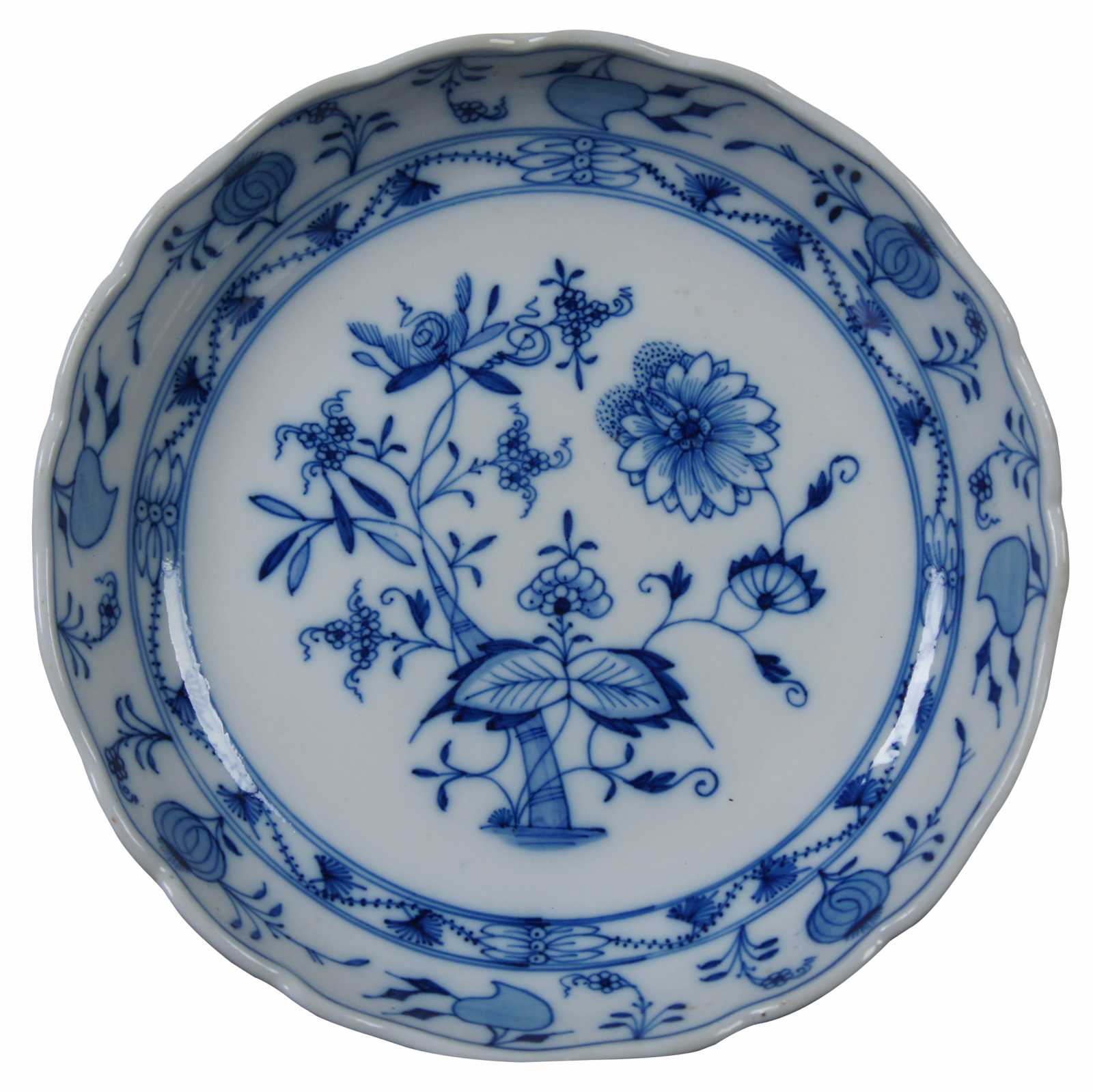 Carl Teichert Meissen porcelain large rim soup bowl. This antique bowl features the blue onion pattern which is a grouping of several floral motifs with stylized peonies and asters in the pattern's center, the stems of which wind in flowing curves around a bamboo stalk. The rim of the bowl has repeating onions around the rim with scalloped edges. The base has the Meissen Oven & Porcelain factory oval with a five star backstamp which was used from 1882 to 1929.
