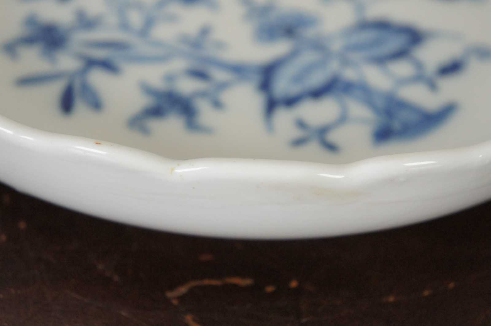 Antique Carl Teichert cobalt blue and white porcelain shallow soup bowl by Meissen in the ""blue onion"" pattern.