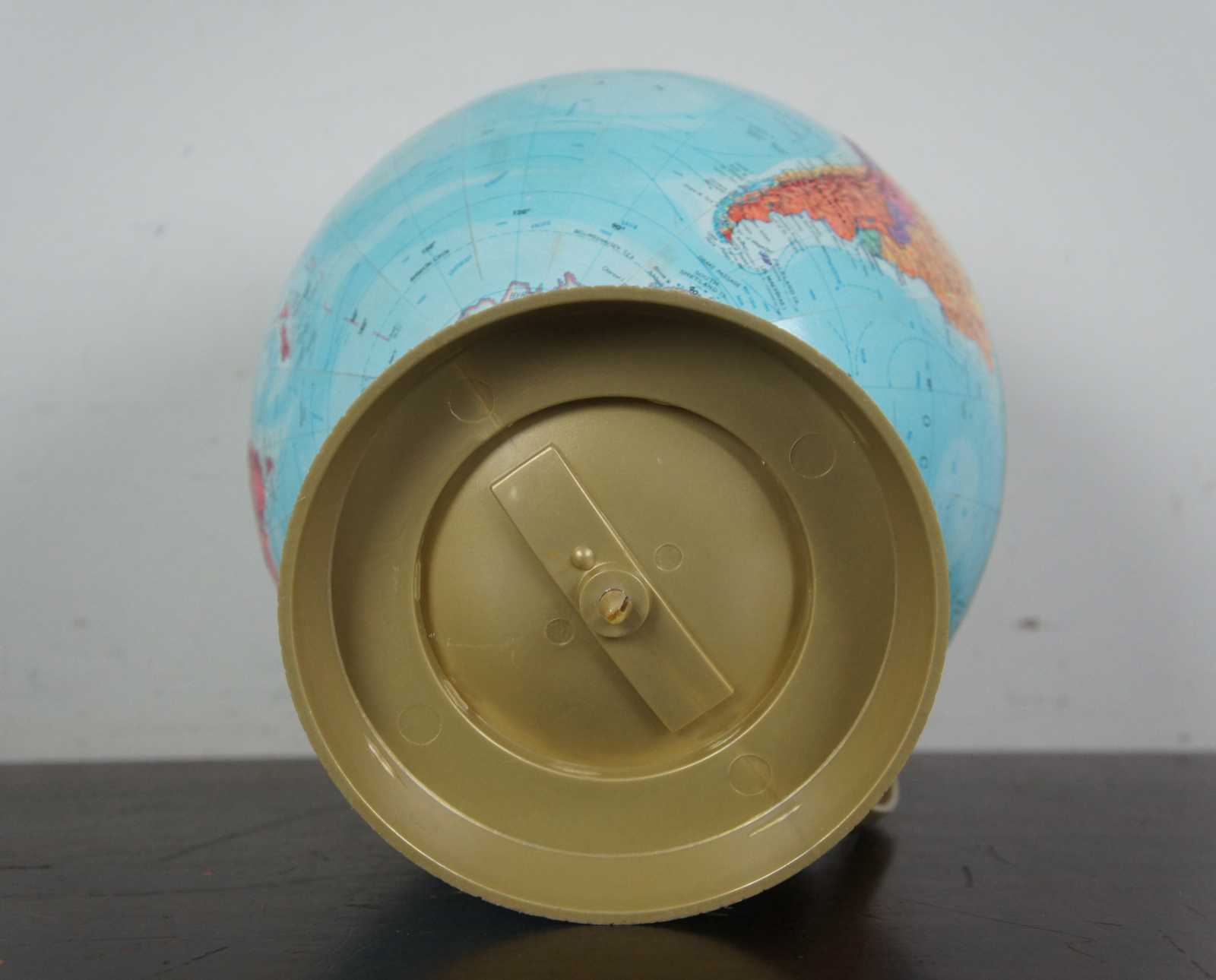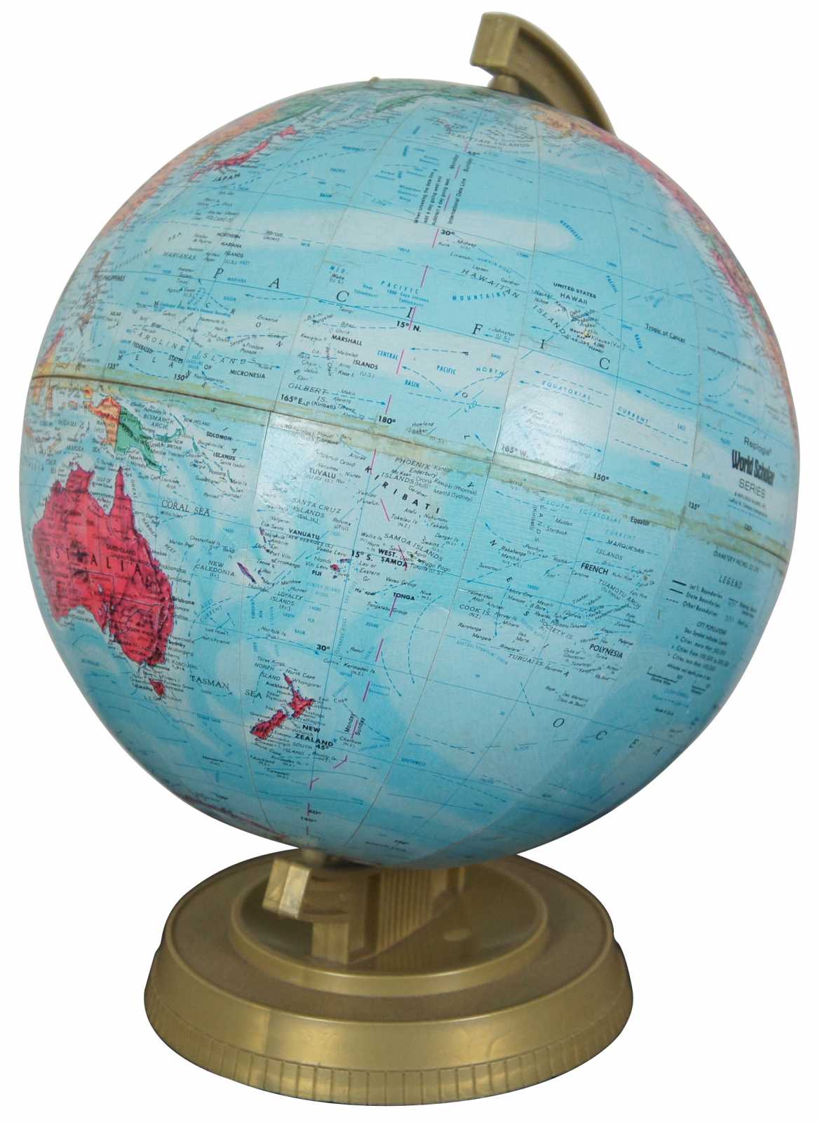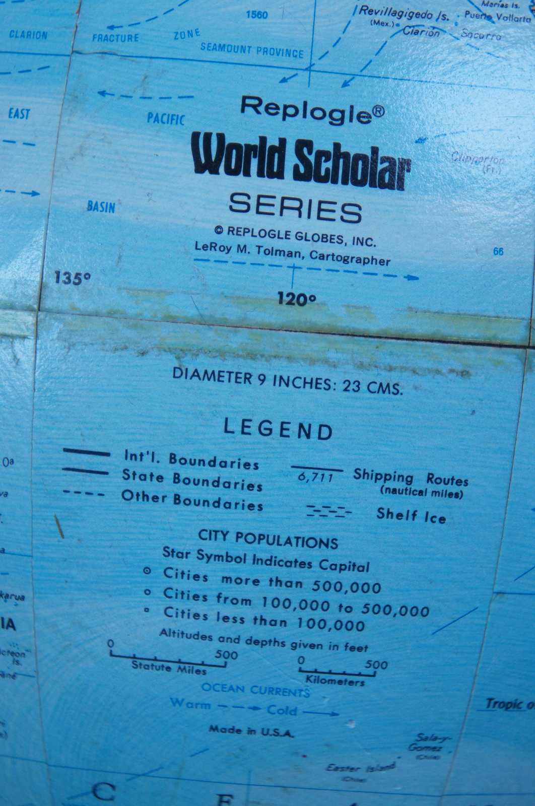 Vintage nine inch diameter World Scholar Series desk globe by Replogle Globes, supported on a gold plastic stand.