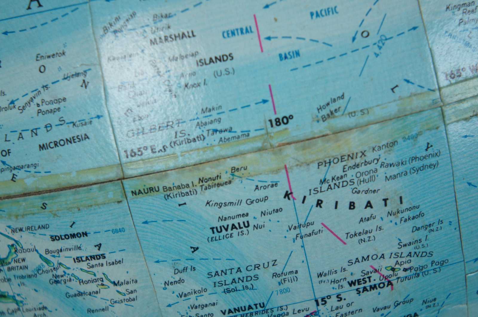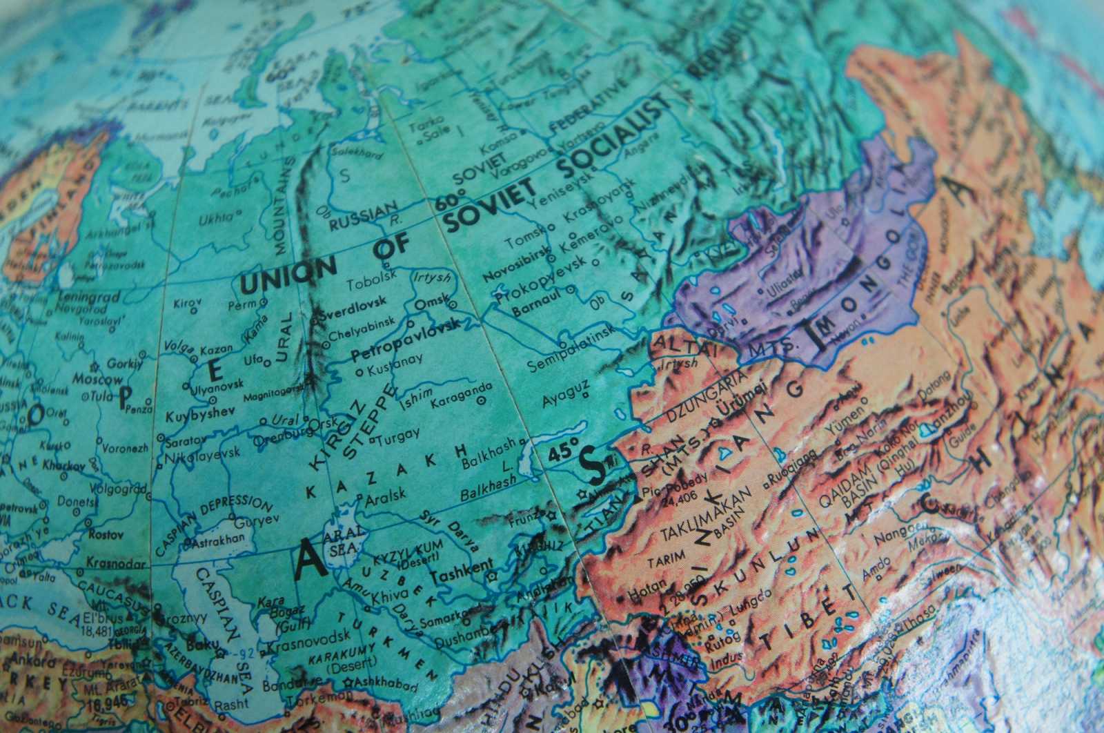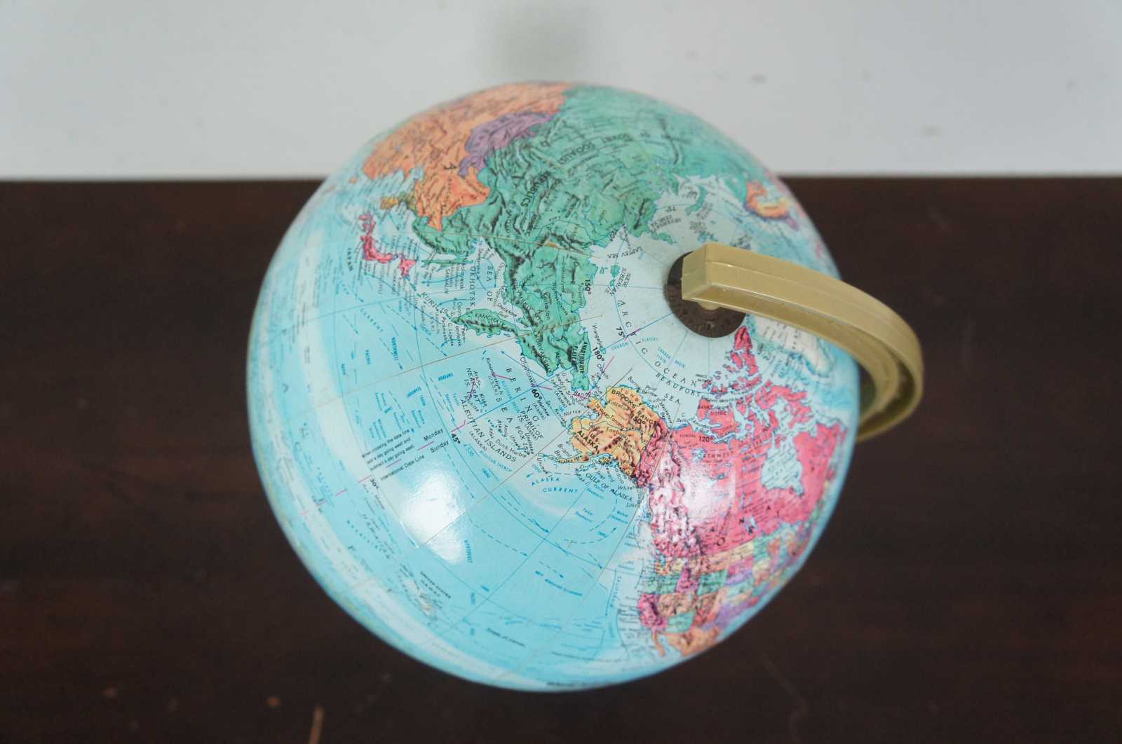 Vintage nine inch diameter World Scholar Series desk globe by Replogle Globes, supported on a gold plastic stand.