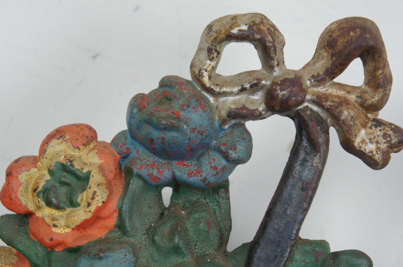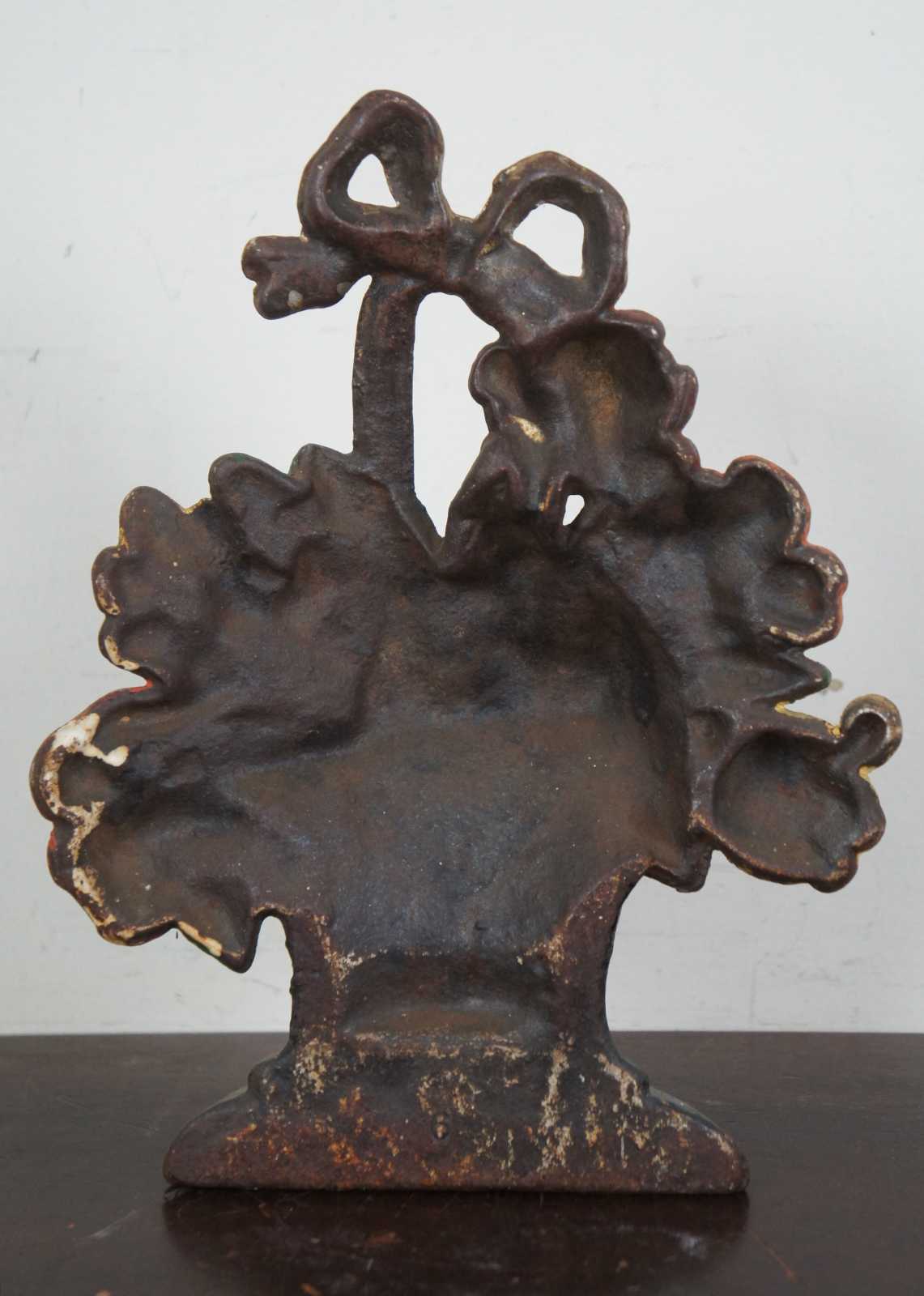 Antique Victorian cast iron door stop in the shape of a basket of flowers, topped with a bow; marked on the back with a number 6.