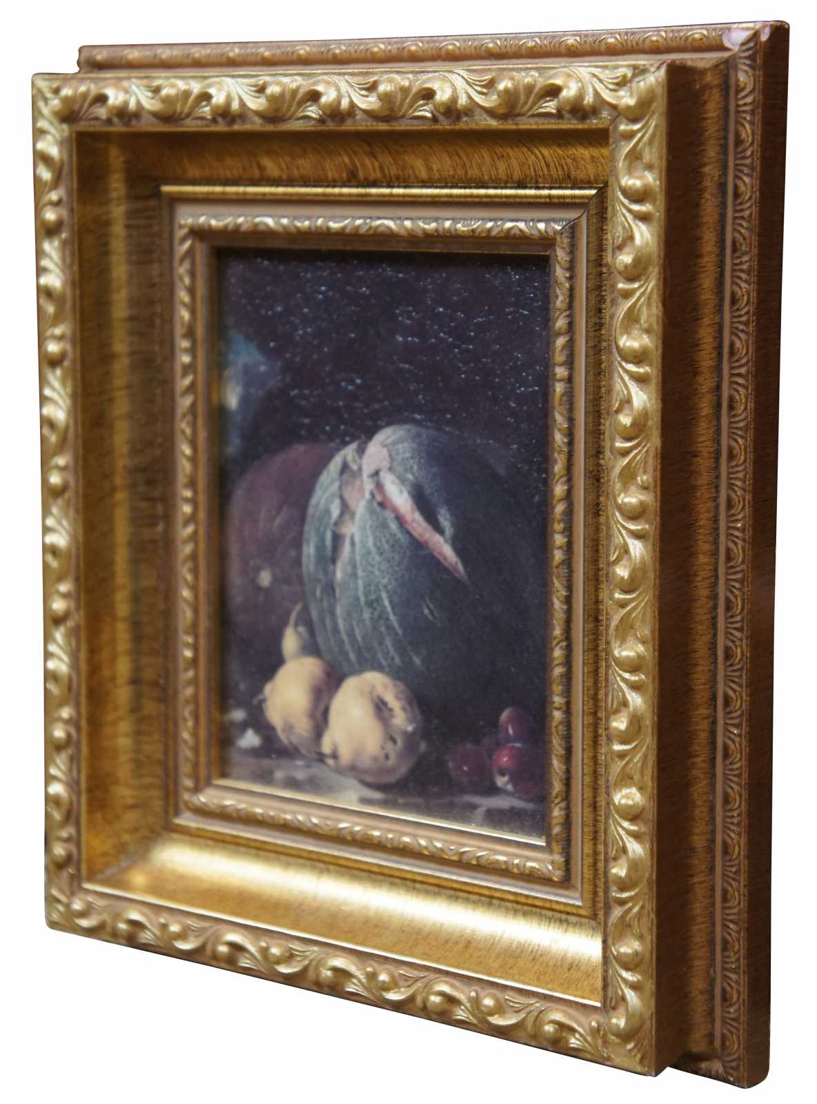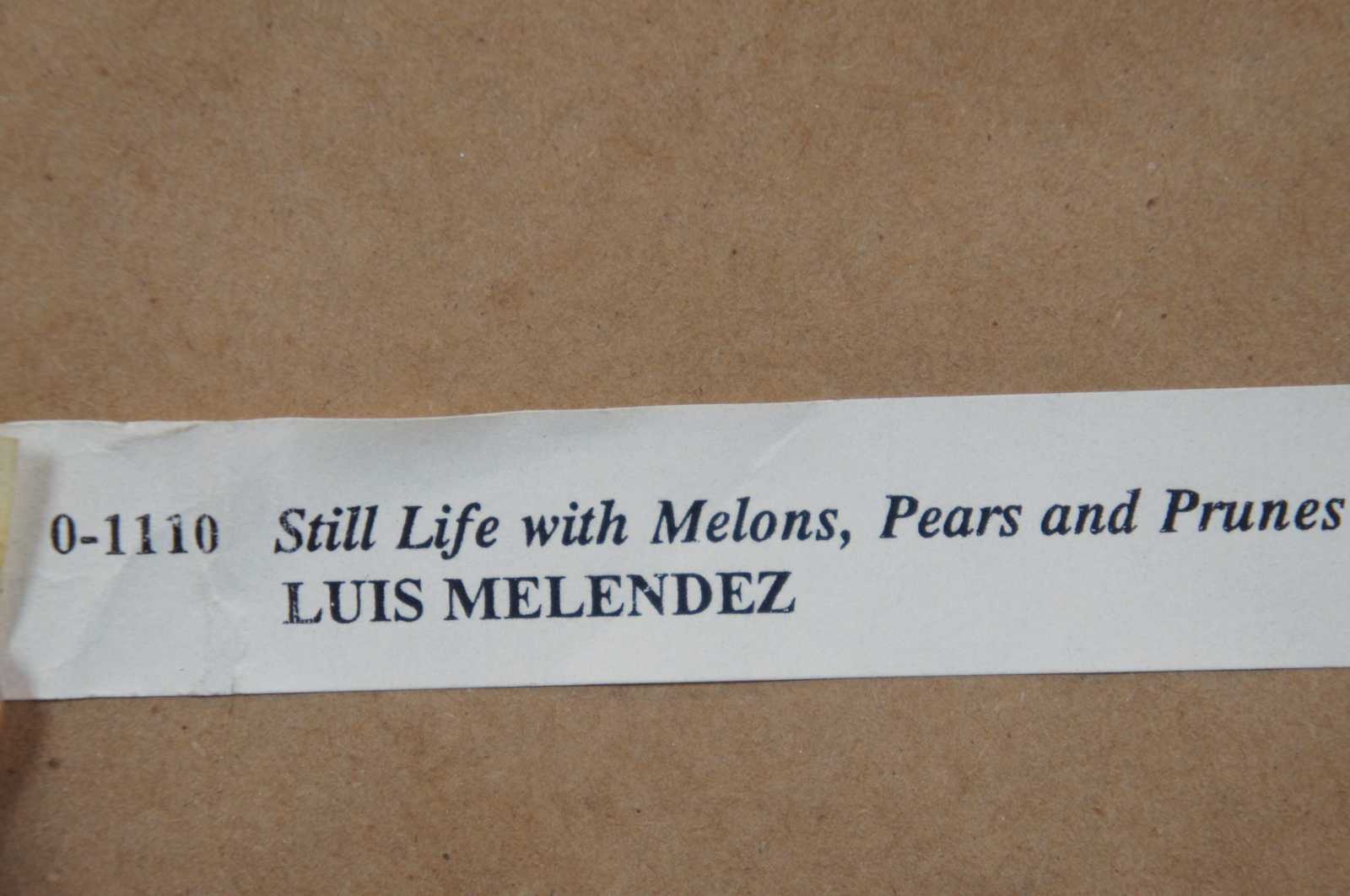 Small vintage giclee print of “Still Life with Melons, Pears and Prunes” by Luis Melendez. Described as "the leading Spanish still life painter of the 18th century", Luis Meléndez was of a family of prominent painters. However, he suffered the end of a promising career because his father, Francisco, got 'crosswise' with the art Academy in Madrid, which he had help found in 1744. As a result of both Francisco and Luis ridiculing the Academy Director, Luis failed to get any court appointment that would bring him income because he along with his father was expelled from the Academy. As a result, he died in poverty. However, during this period, which was the last 20 years of his life, he painted miniatures and about 100 still life, many of them intended to be hung as pairs. Some of them had landscape backgrounds. However, in those days still lifes were regarded as purely a decorative genre, and, although the Academy condoned still-life painting, it did not carry the stature of more traditional painting. Luis Melendez was born in Naples in 1716, when it was under Spanish control, and shortly after, he moved to Spain. He studied at the Academy, and the self portrait he did at the Academy in 1746 was judged very skillful.