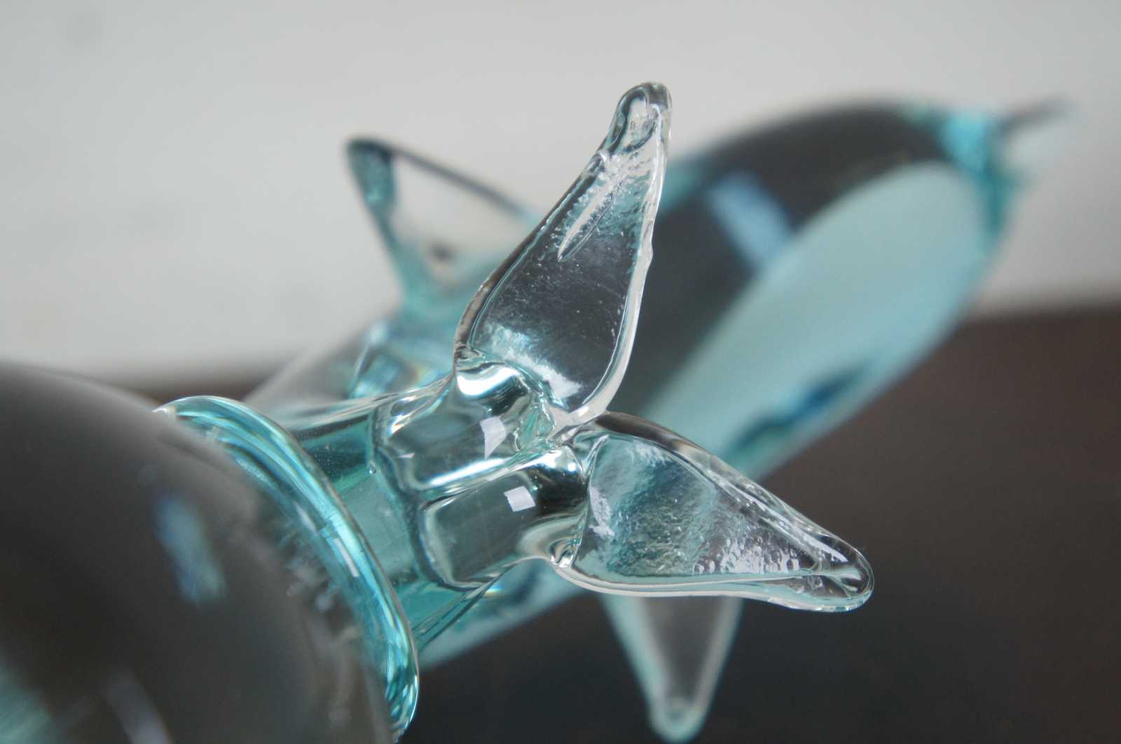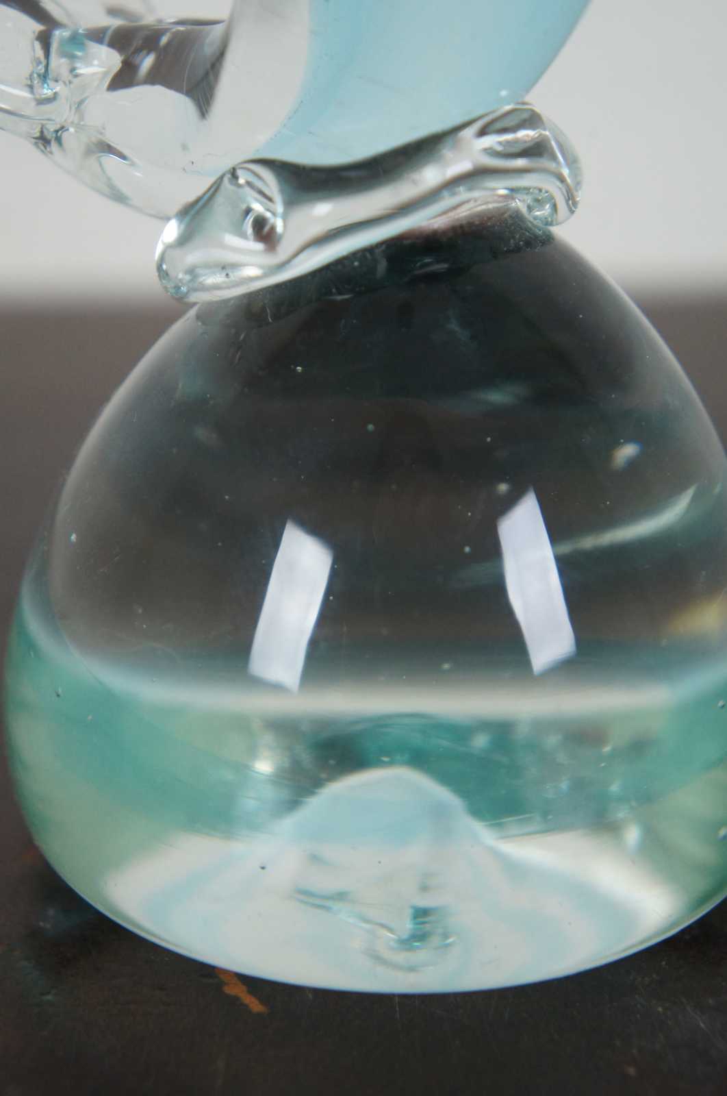 Vintage Murano art glass figurine of a dolphin standing upright on its tail on a rounded base in pale blue hand blown glass.
