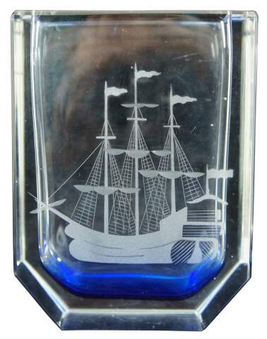 Vintage glass vase with a cobalt blue base emphasizing the etched gallion / boat / sail ship design on the side.