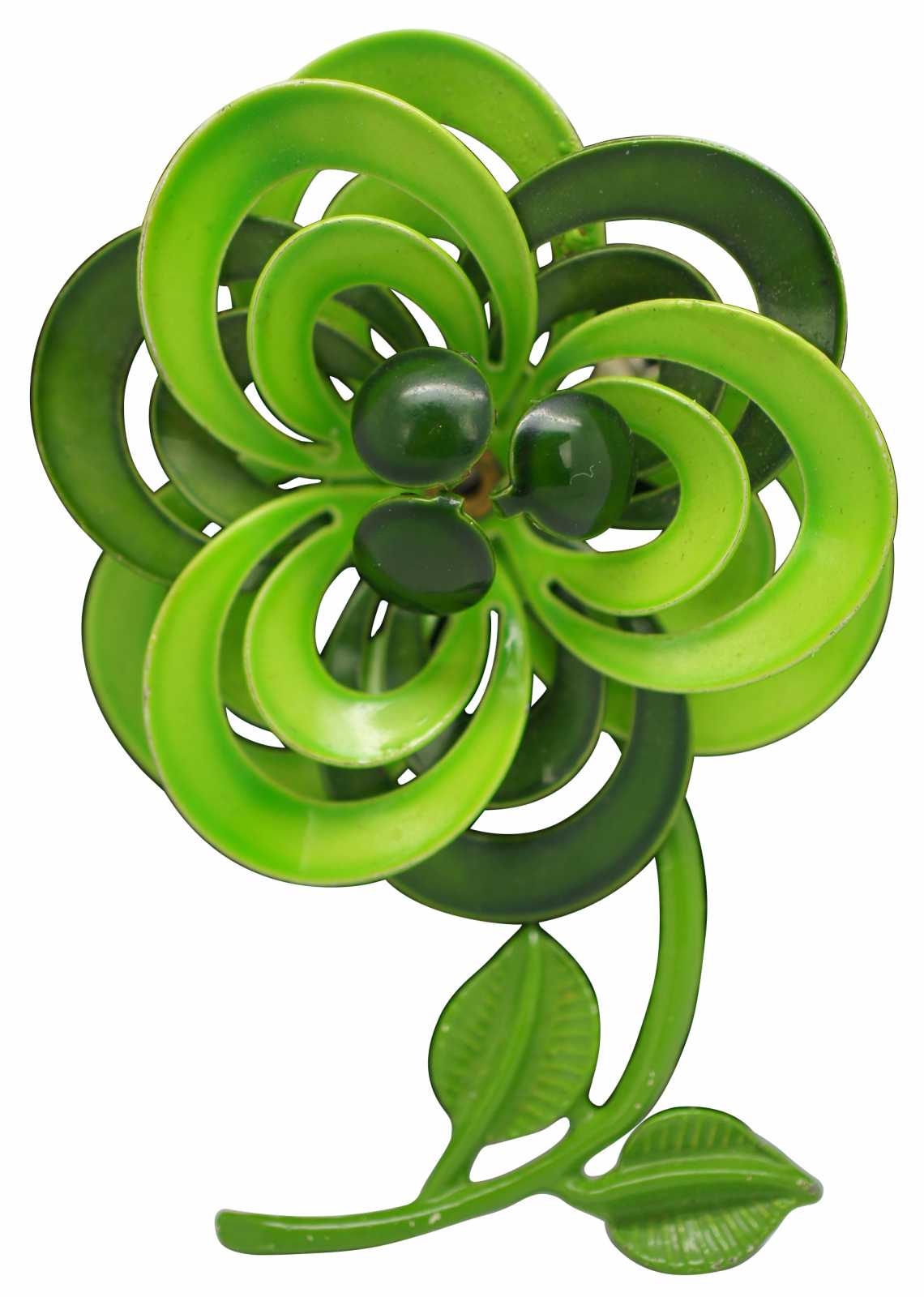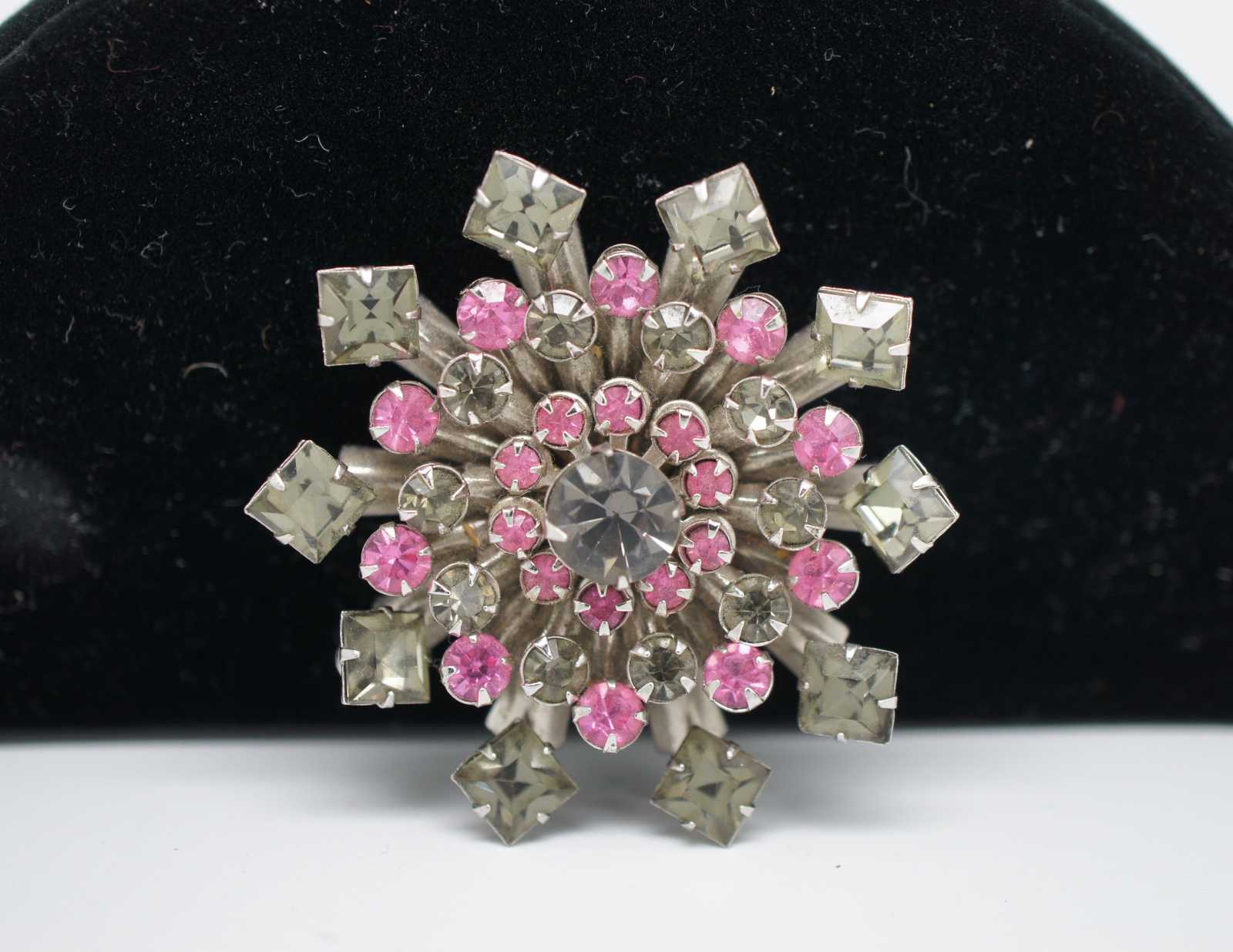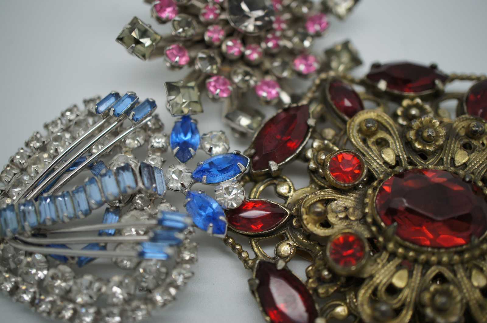 Lot of 5 costume jewelry brooches – green enameled flower, black “carved” floral oval, pink and white rhinestone starburst, blue and white rhinestone heart, and brass filigree with red rhinestones.