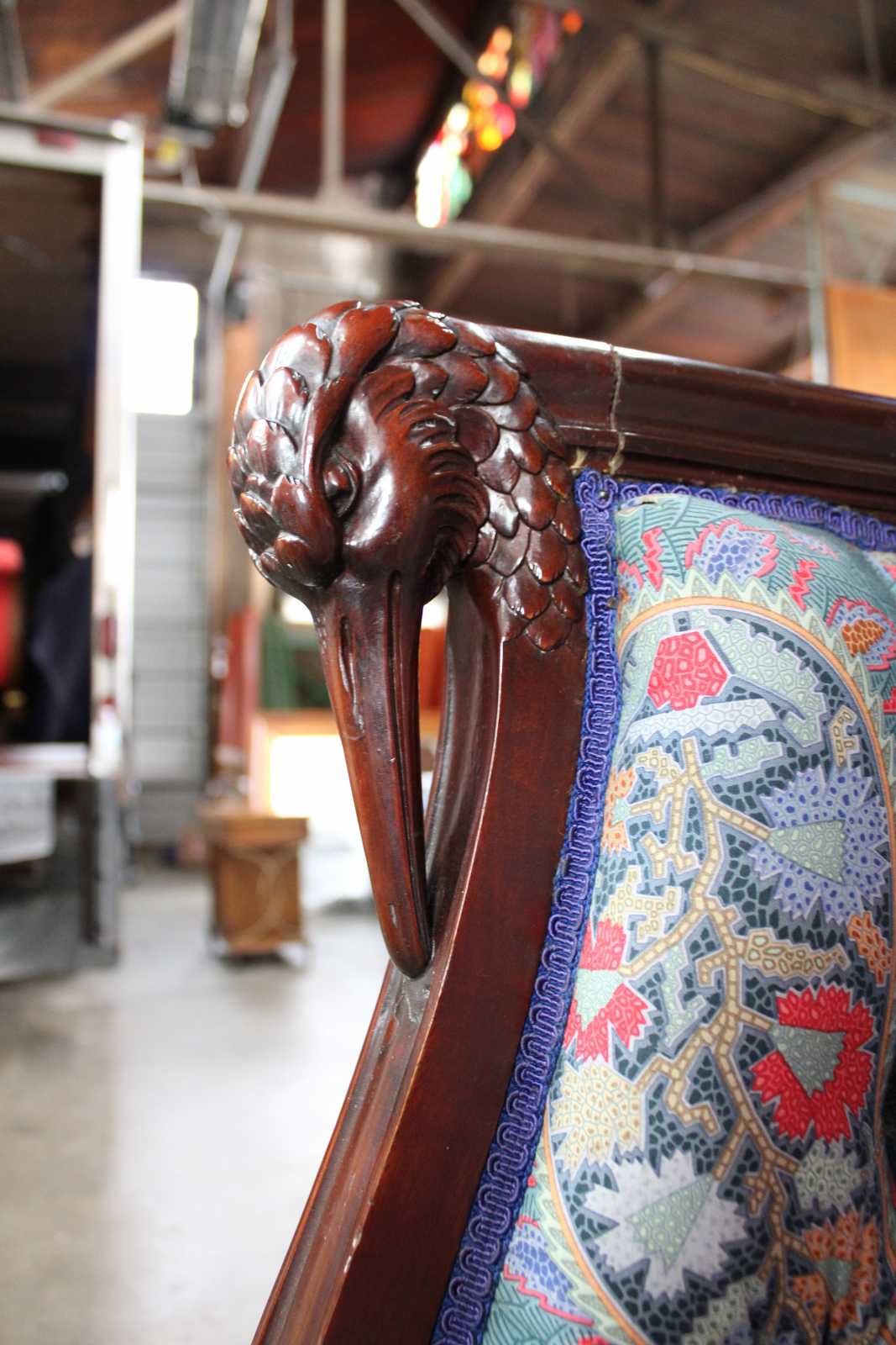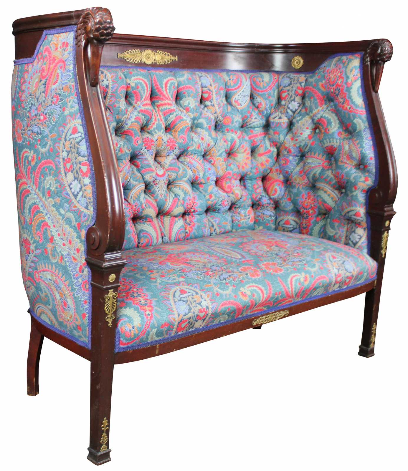 Antique French Empire figural high back settee. Features tufted modern vibrant paisley upholstery with tall rounded back, gilt accents, and carved swan / bird head arms.