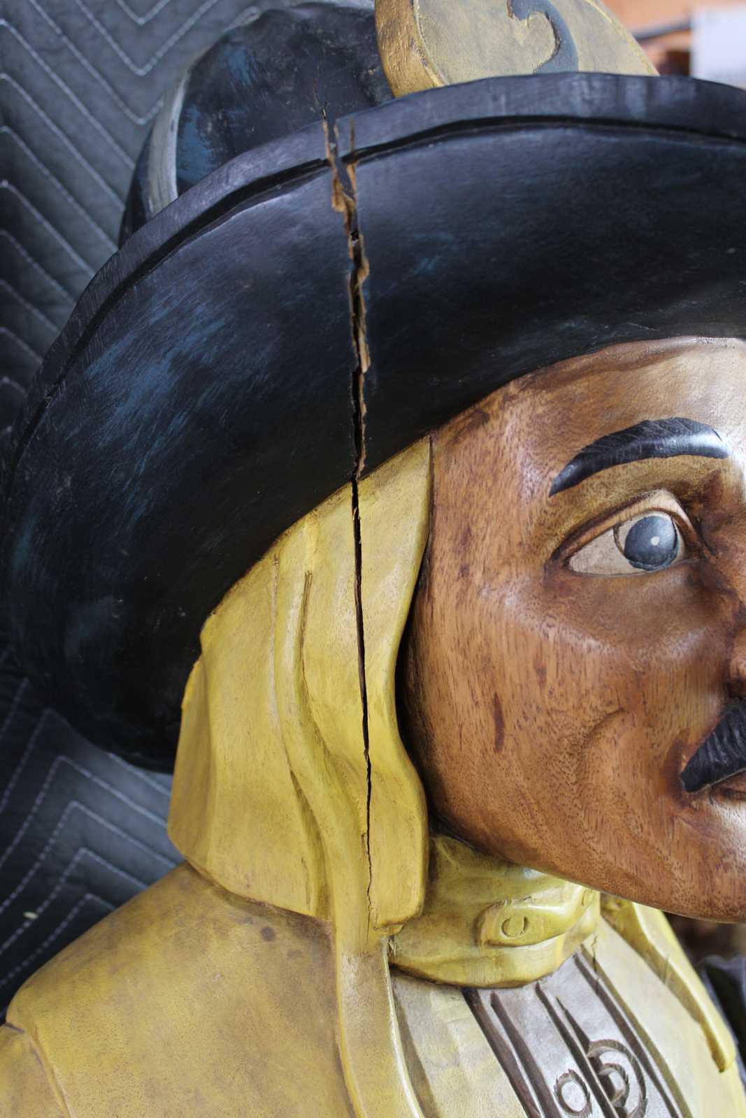 Vintage Cigar store fireman or firefighter. Features a fireman in yellow with black boots and #2 hat holding an ax and baby. Carved from one piece of wood.
