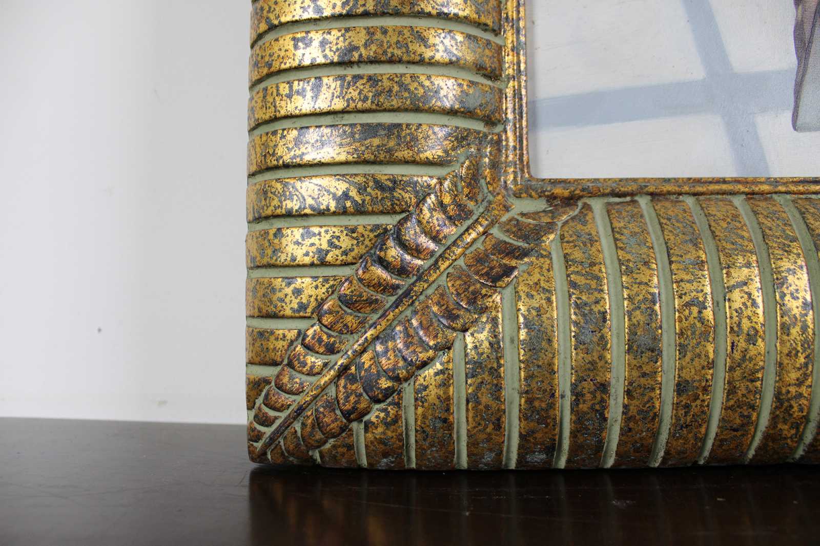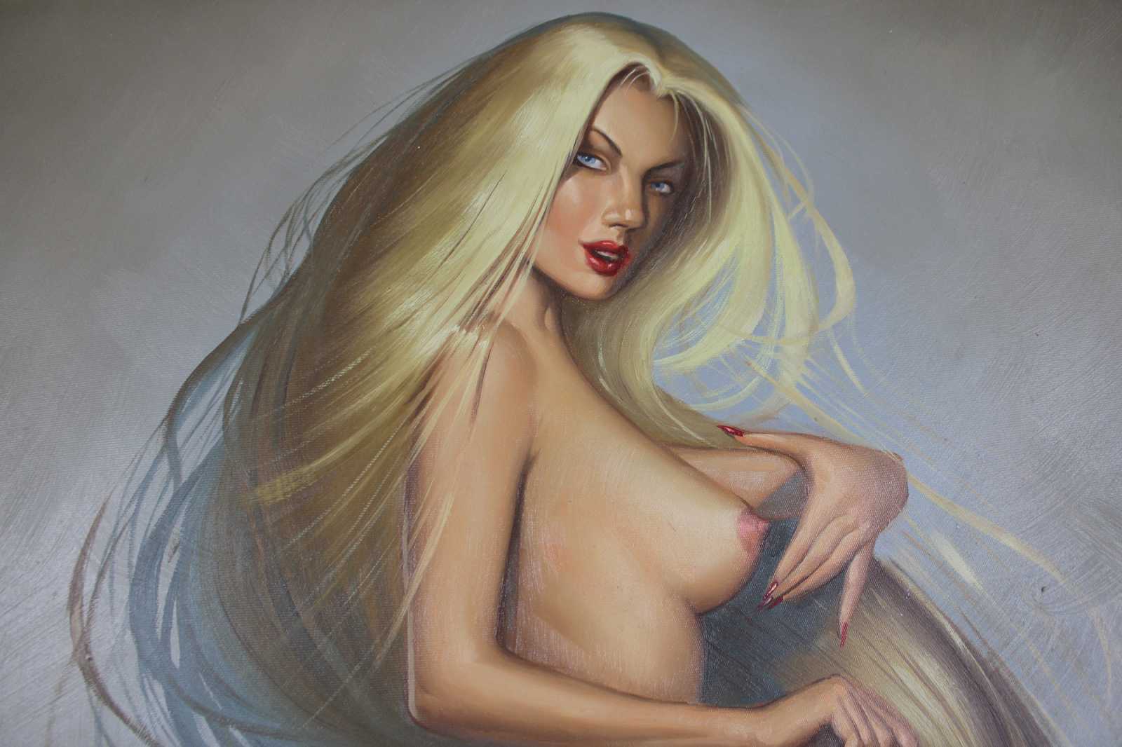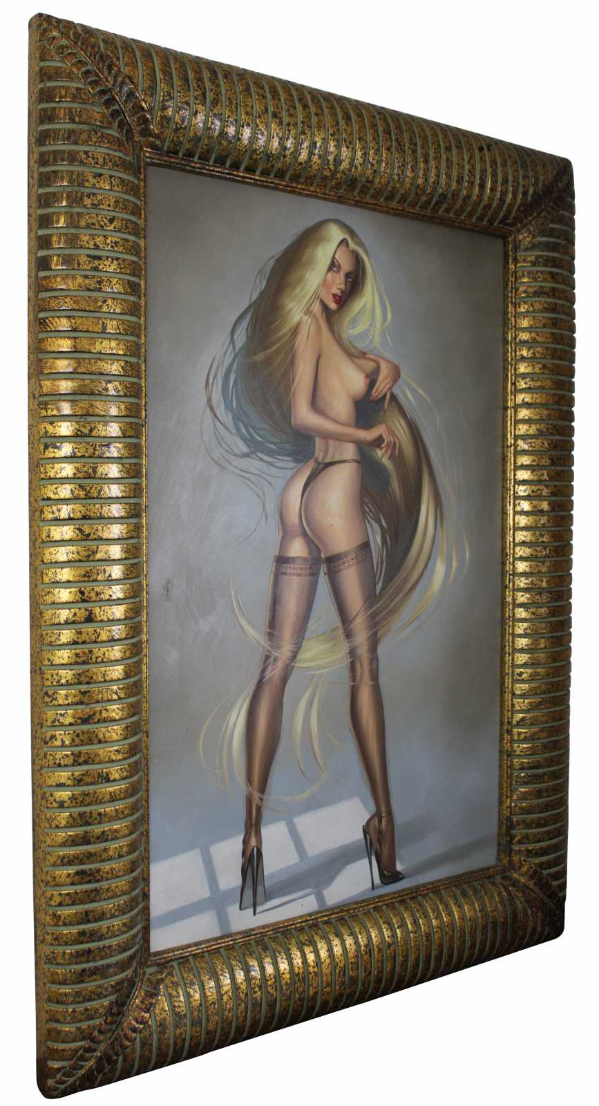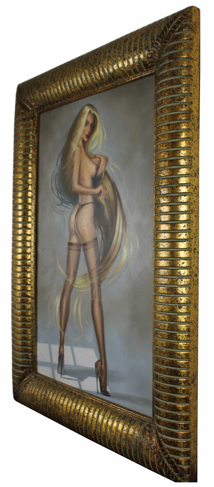 20th century erotic woman oil painting. Features a blonde woman with long flowing hair, dressed in lingerie and high heels. Framed in gold. Unsigned.