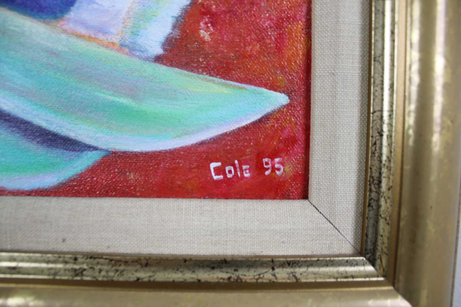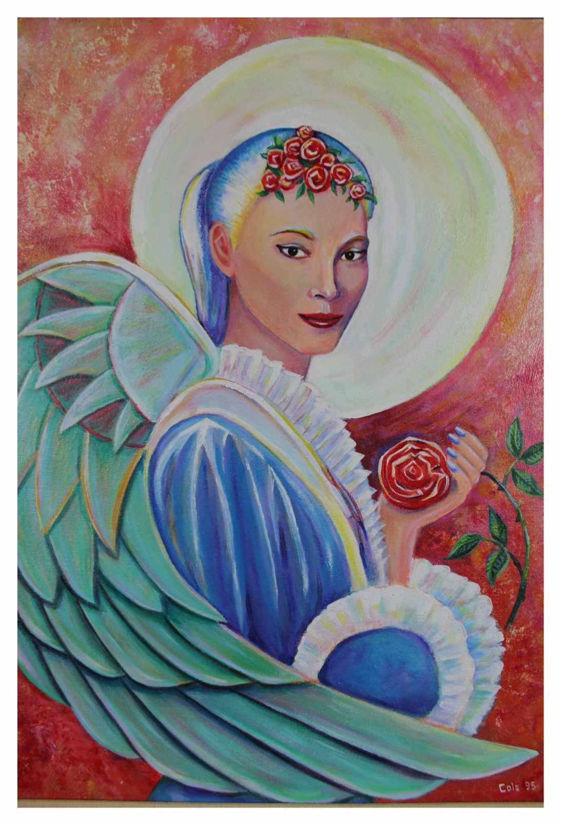 Vintage 1995 Archangel or Guardian Angel oil painting by Cole. Features an Angel of high rank dressed in a royal blue robe with roses, turquoise wings and Halo. Painted in vibrant colors.