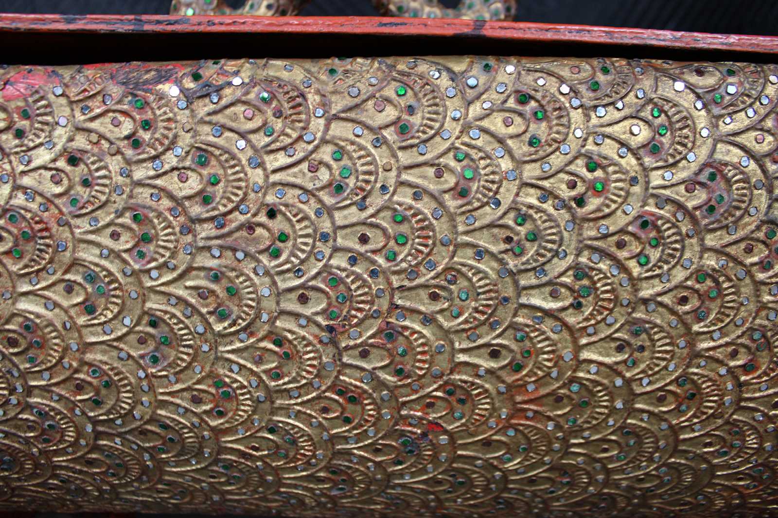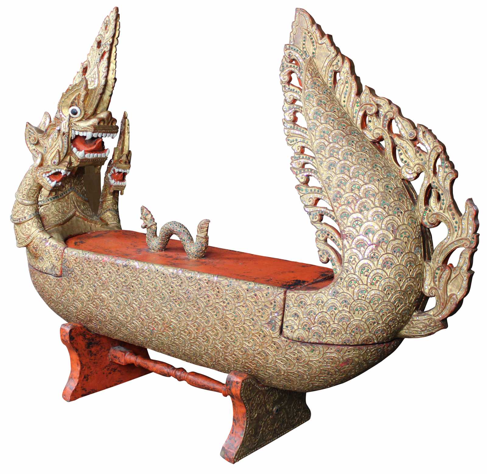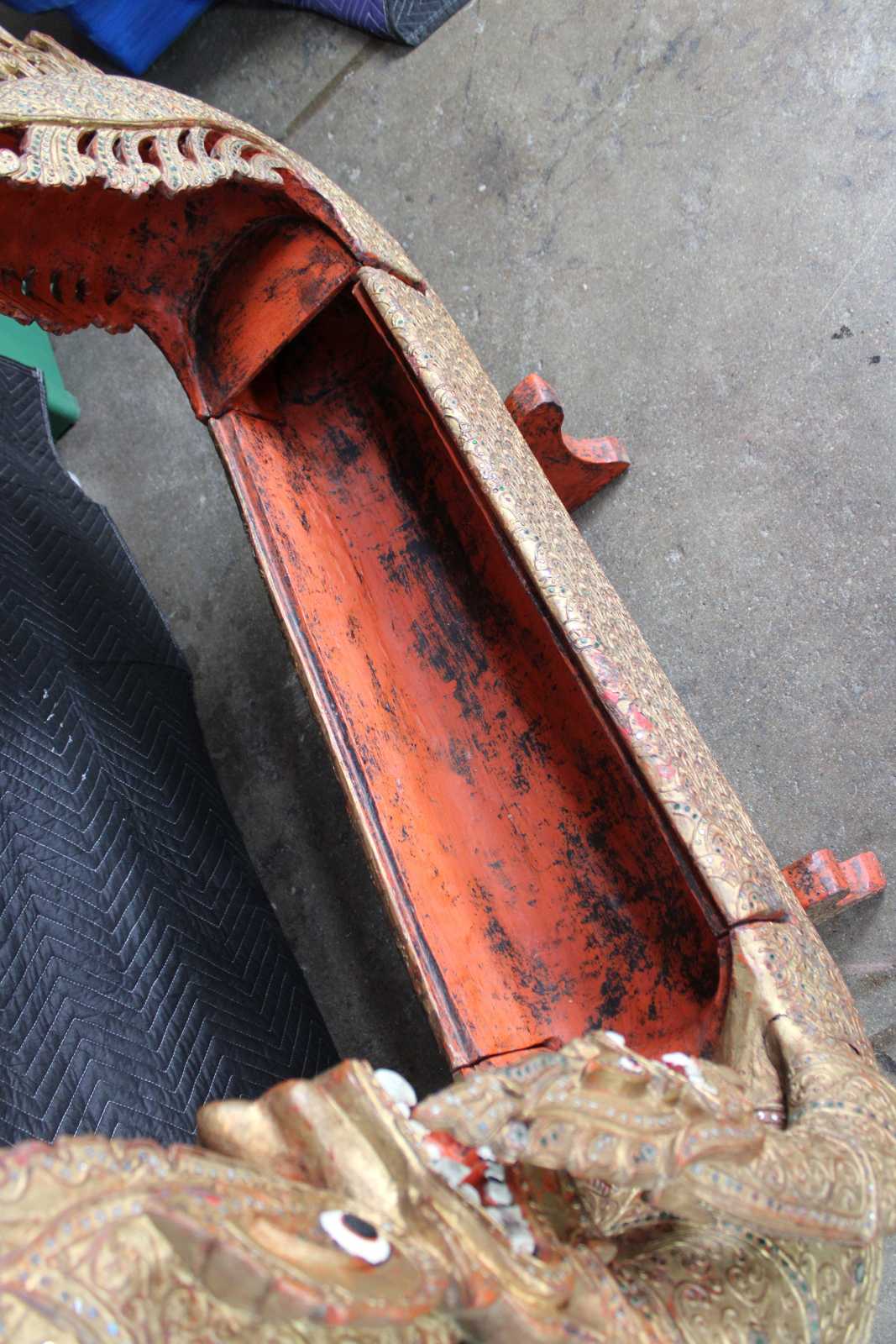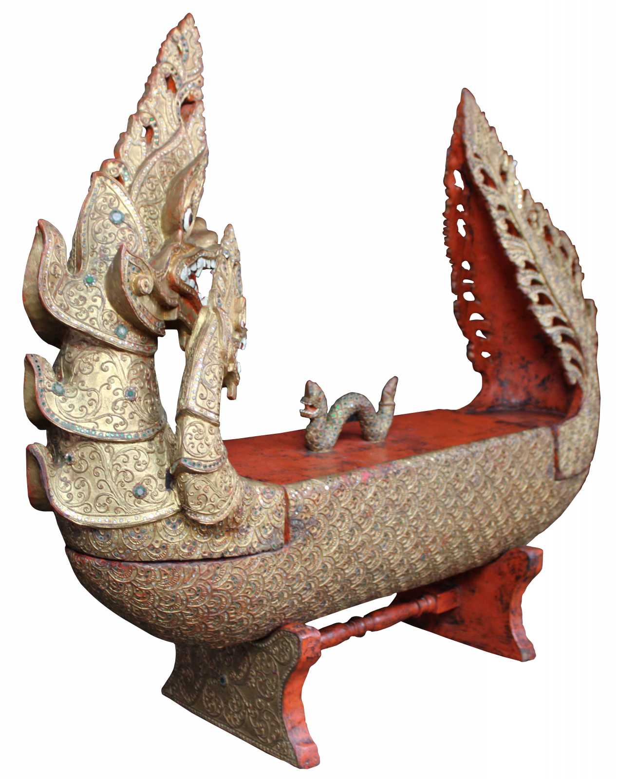 Elaborately carved Burmese Royal Barge boat box. Features red lacquered finish, with gold gilt, embellished with jeweled inserts. Dragon / serpent motif handle lid reveals storage compartment.