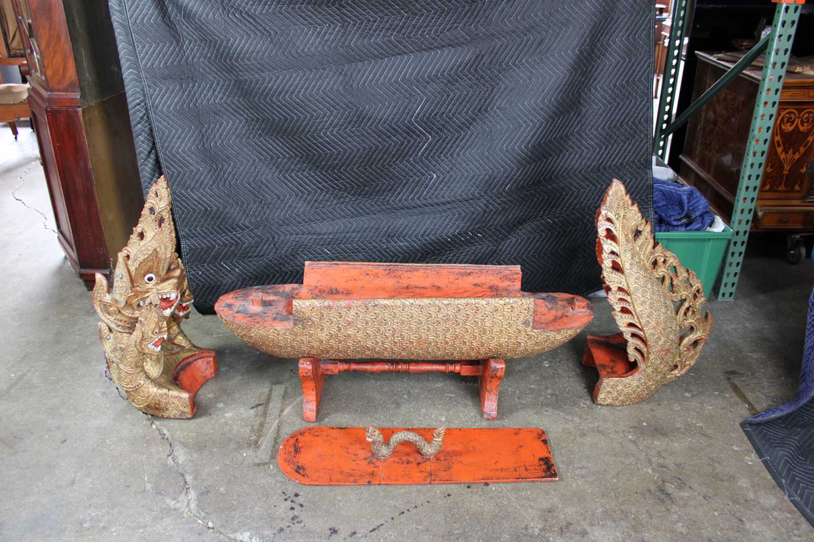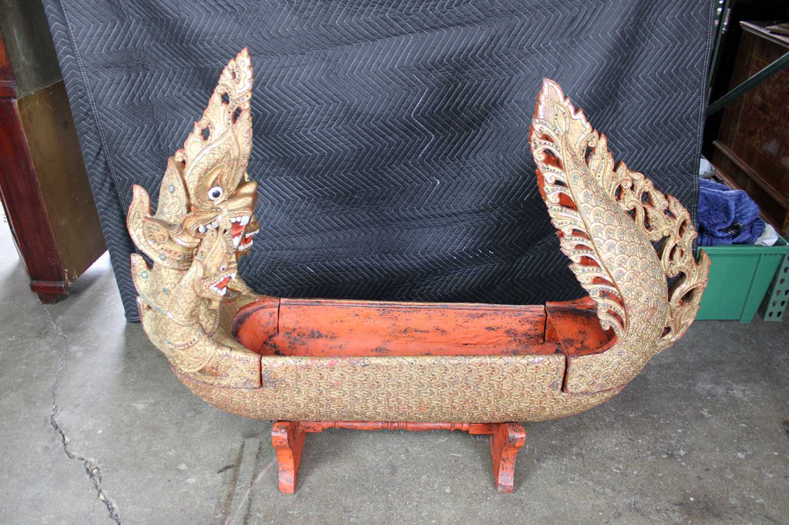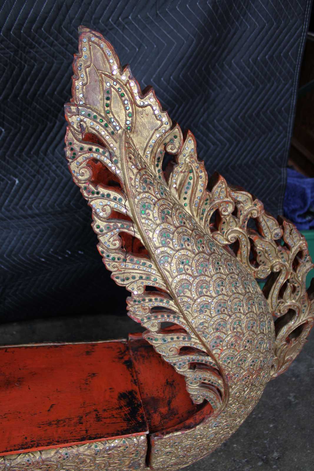 Elaborately carved Burmese Royal Barge boat box. Features red lacquered finish, with gold gilt, embellished with jeweled inserts. Dragon / serpent motif handle lid reveals storage compartment.