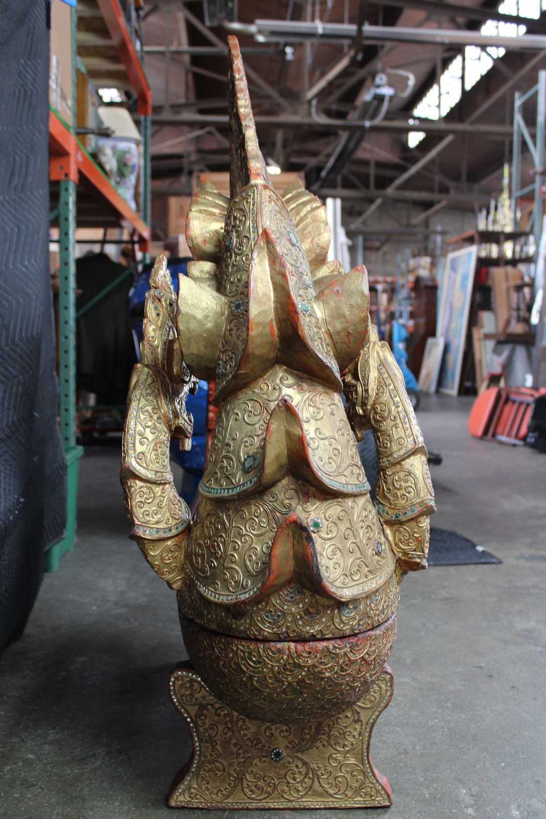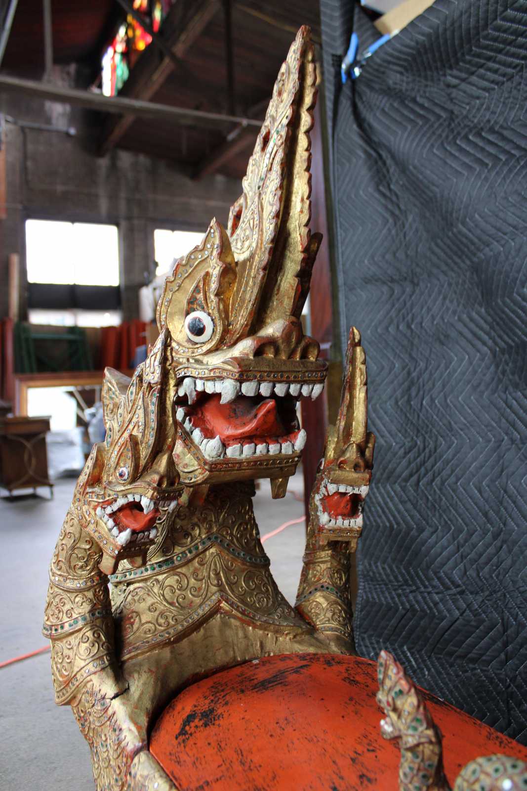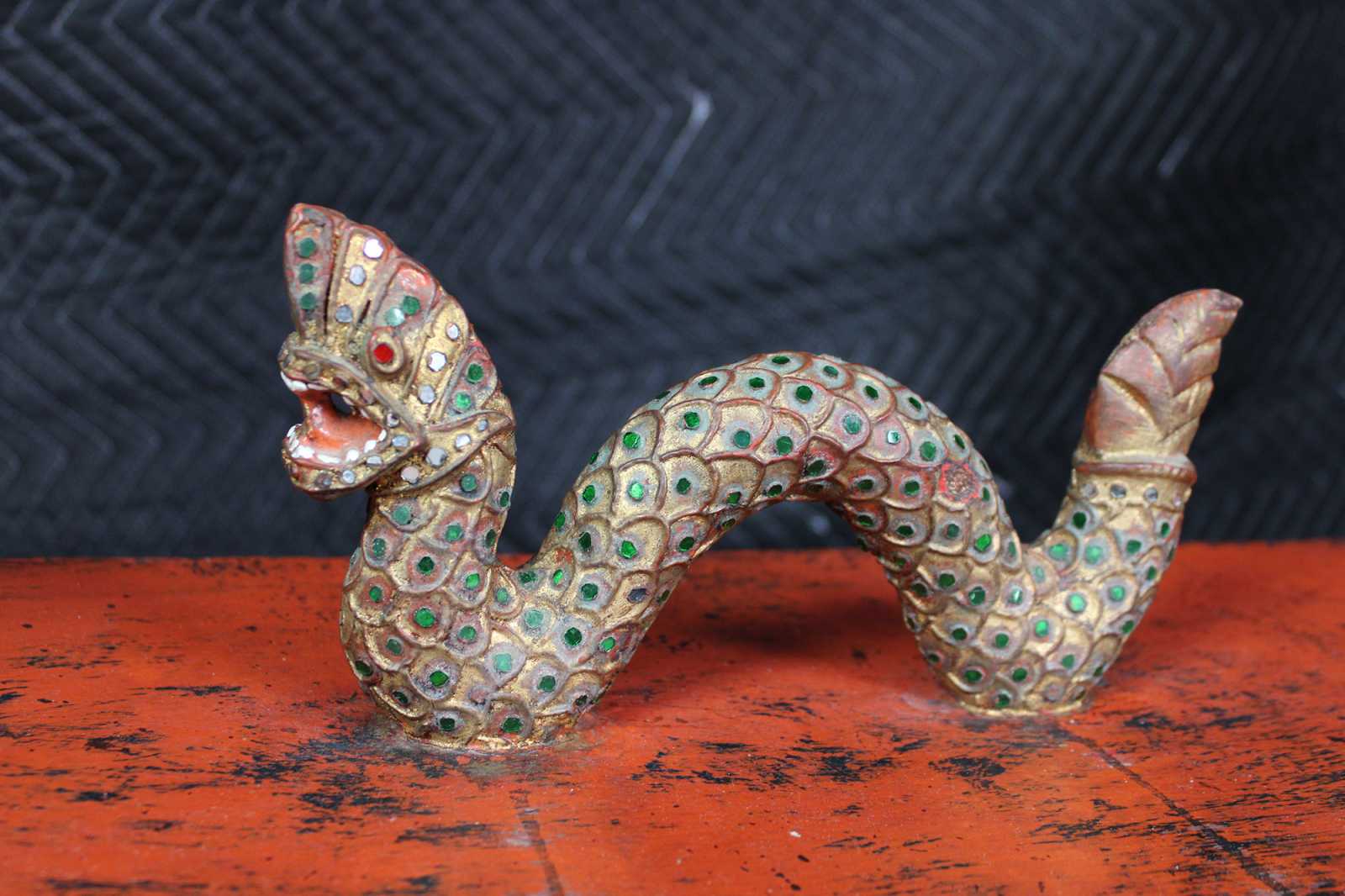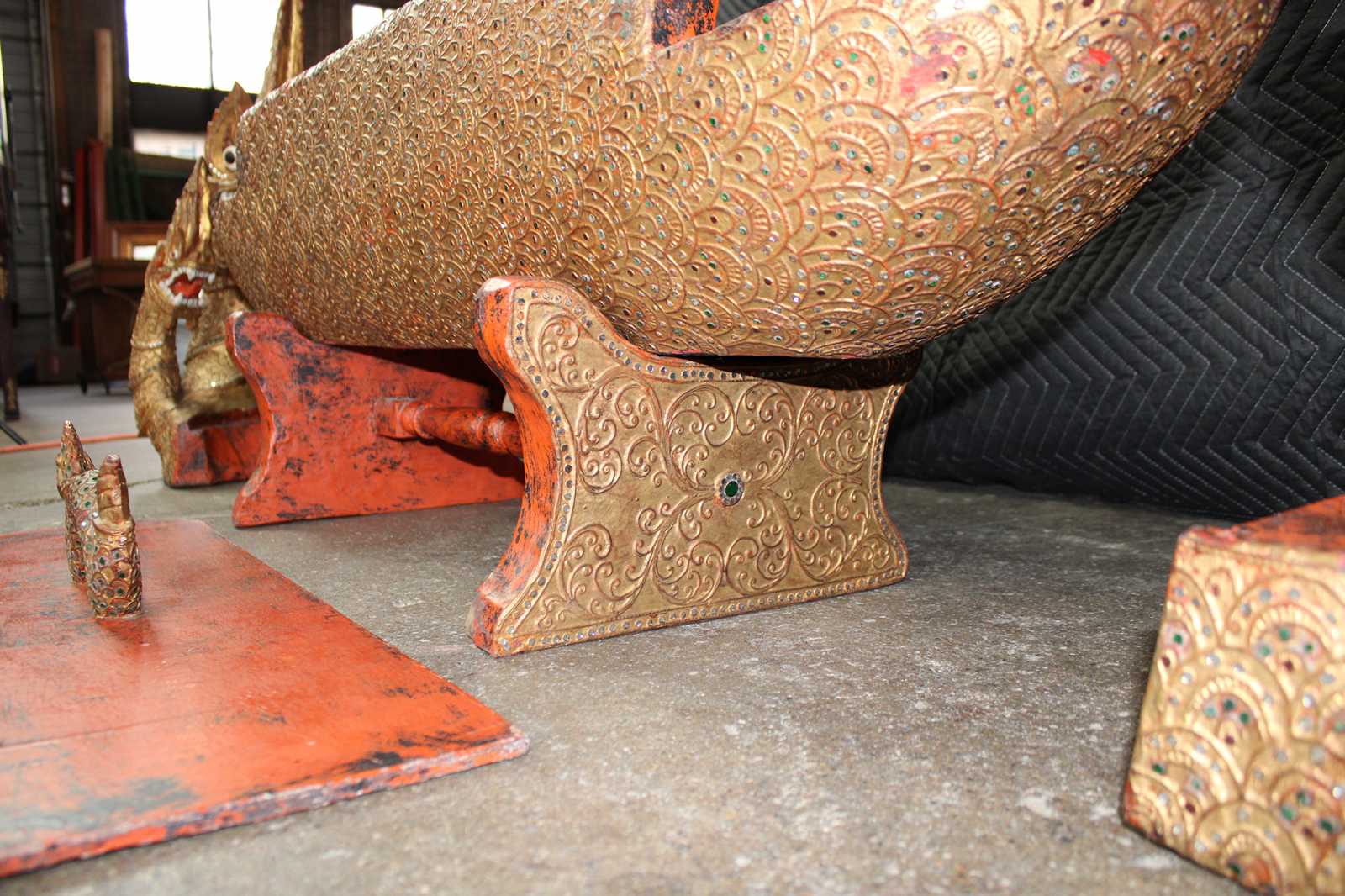 Elaborately carved Burmese Royal Barge boat box. Features red lacquered finish, with gold gilt, embellished with jeweled inserts. Dragon / serpent motif handle lid reveals storage compartment.