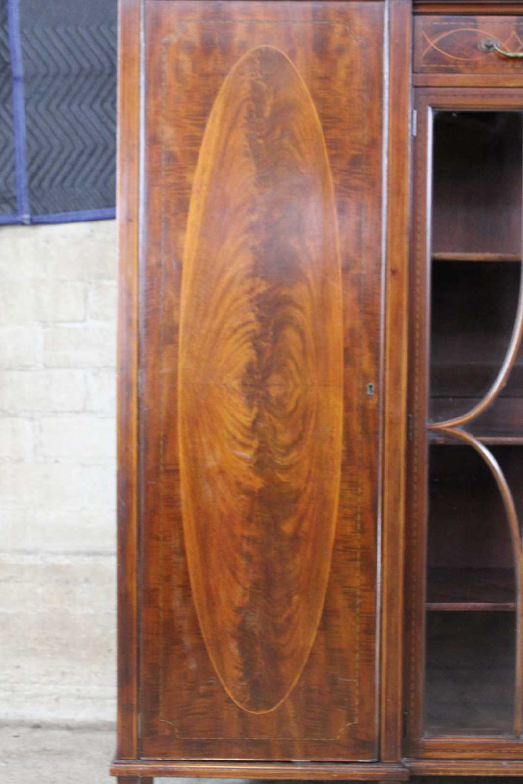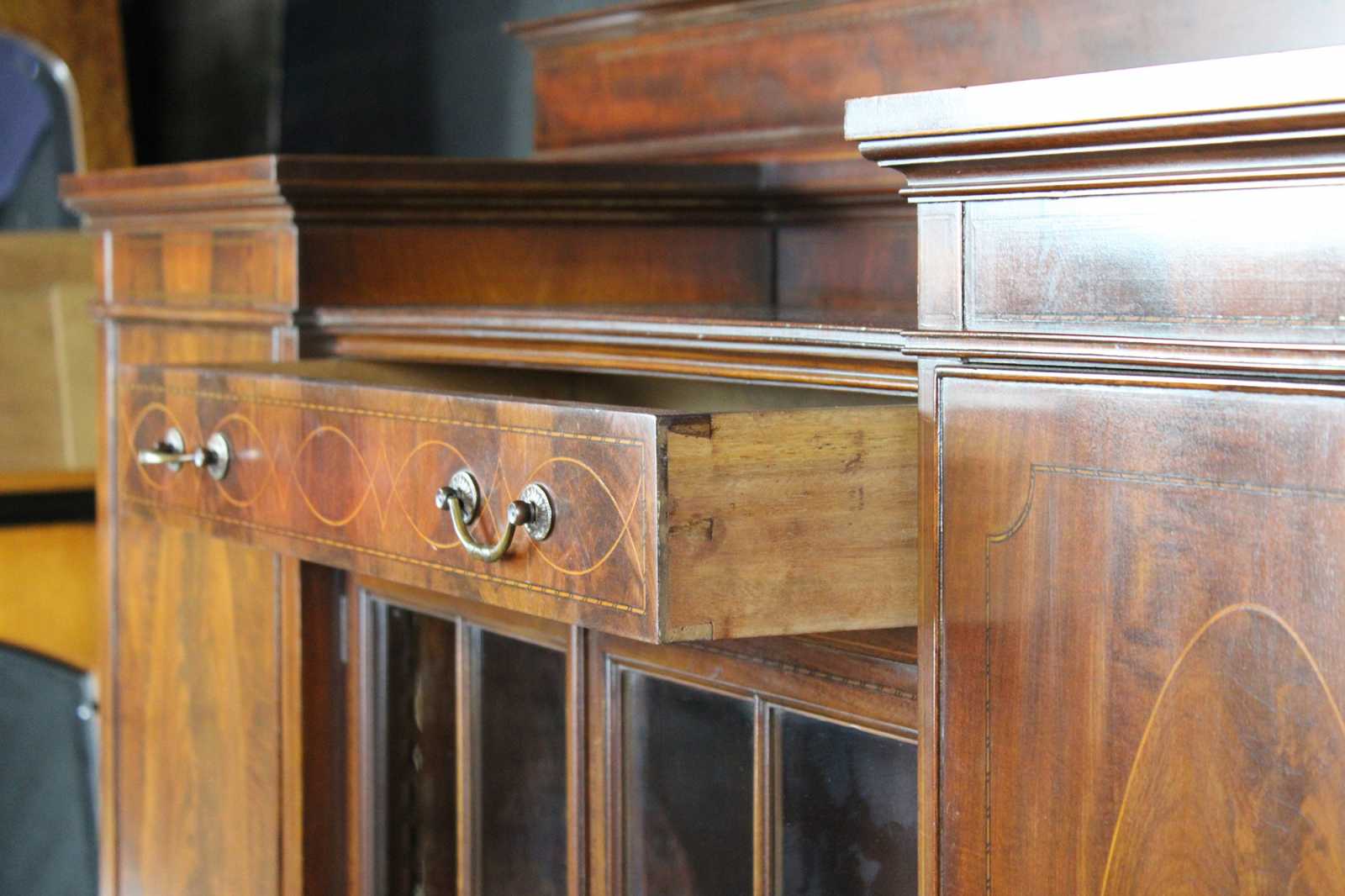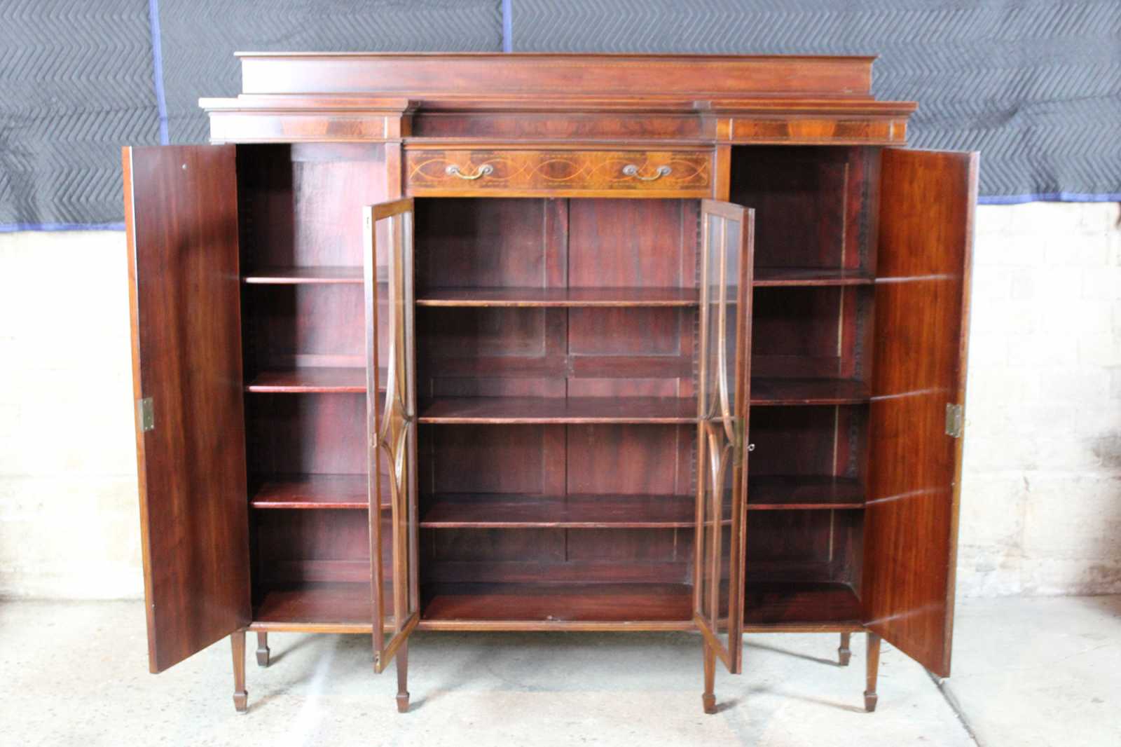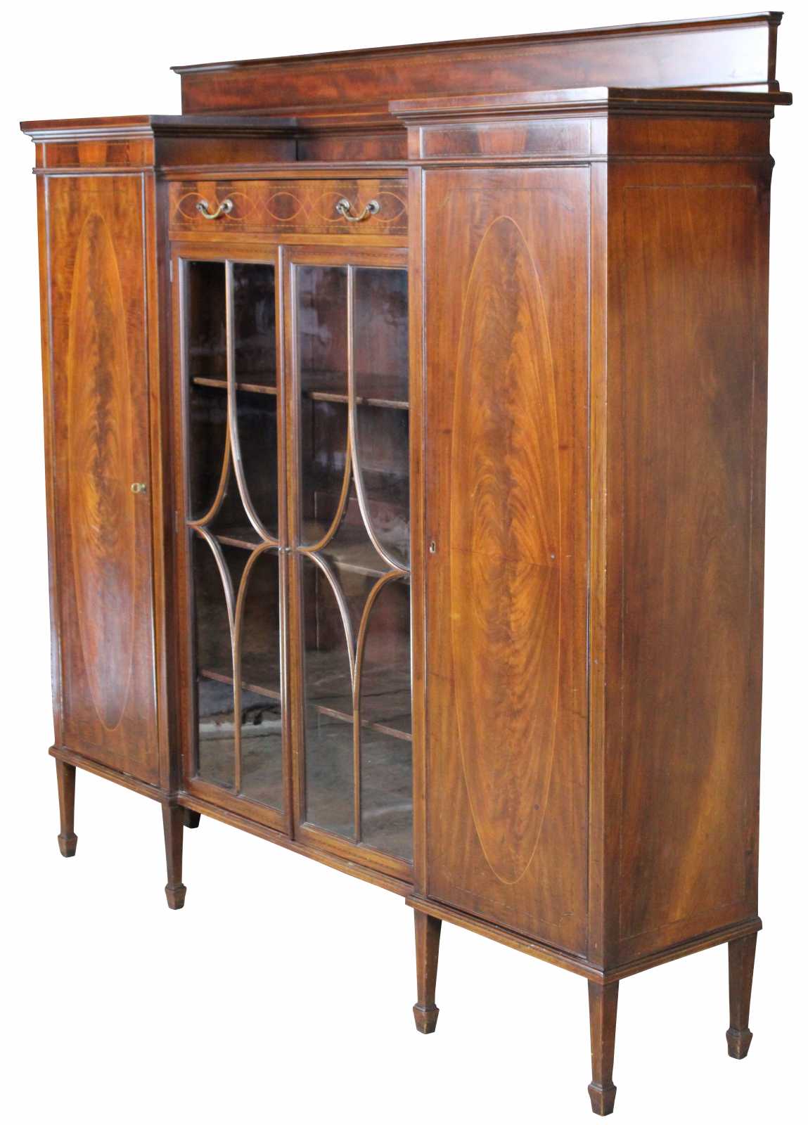 Monumental early 19th century Sheraton library bookcase. Features a central curio cabinet and upper drawer flanked by outer bookcases. Made from crotch (flamed) mahogany with beautifully burled doors, satinwood inlay, diamond pattern fretwork and brass hardware. The cabinet is supported by square tapered legs leading to spade feet.