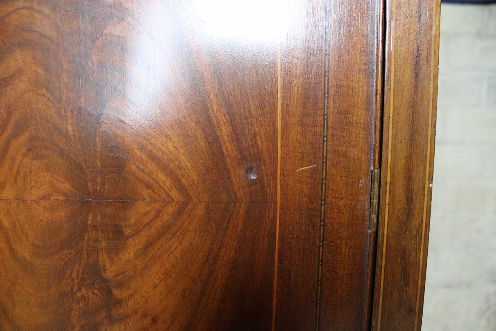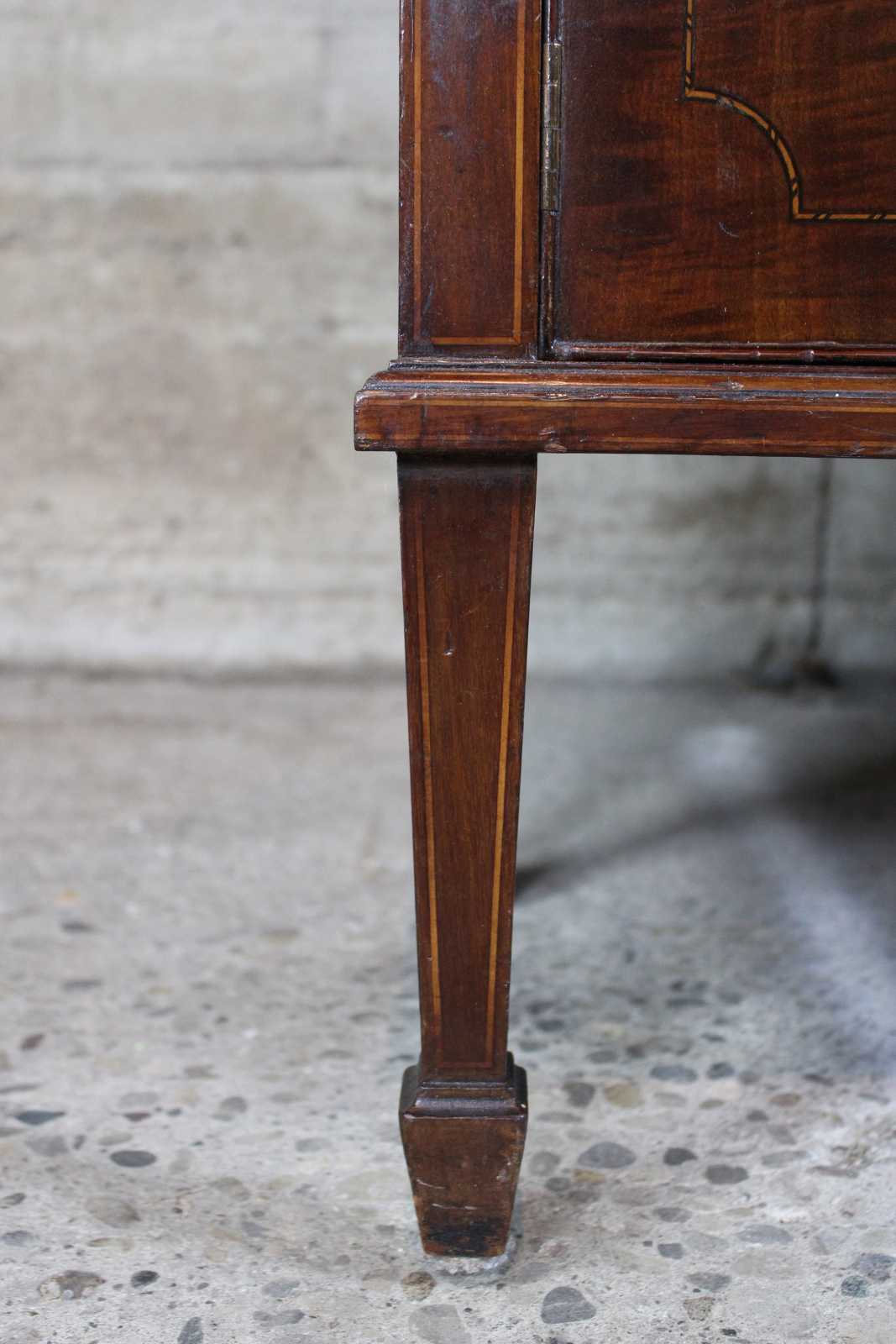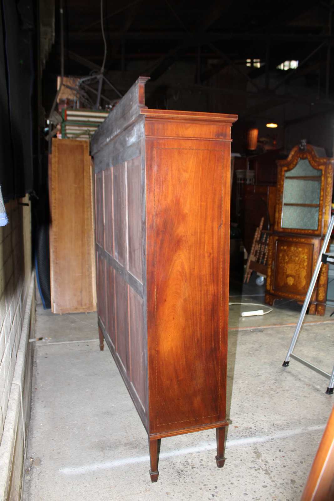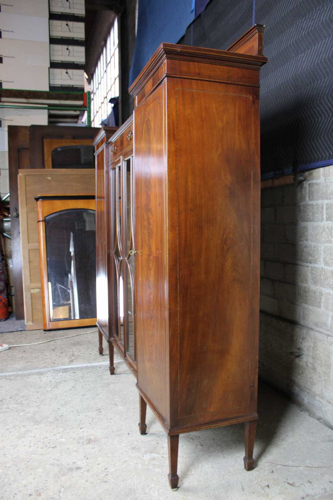 Monumental early 19th century Sheraton library bookcase. Features a central curio cabinet and upper drawer flanked by outer bookcases. Made from crotch (flamed) mahogany with beautifully burled doors, satinwood inlay, diamond pattern fretwork and brass hardware. The cabinet is supported by square tapered legs leading to spade feet.