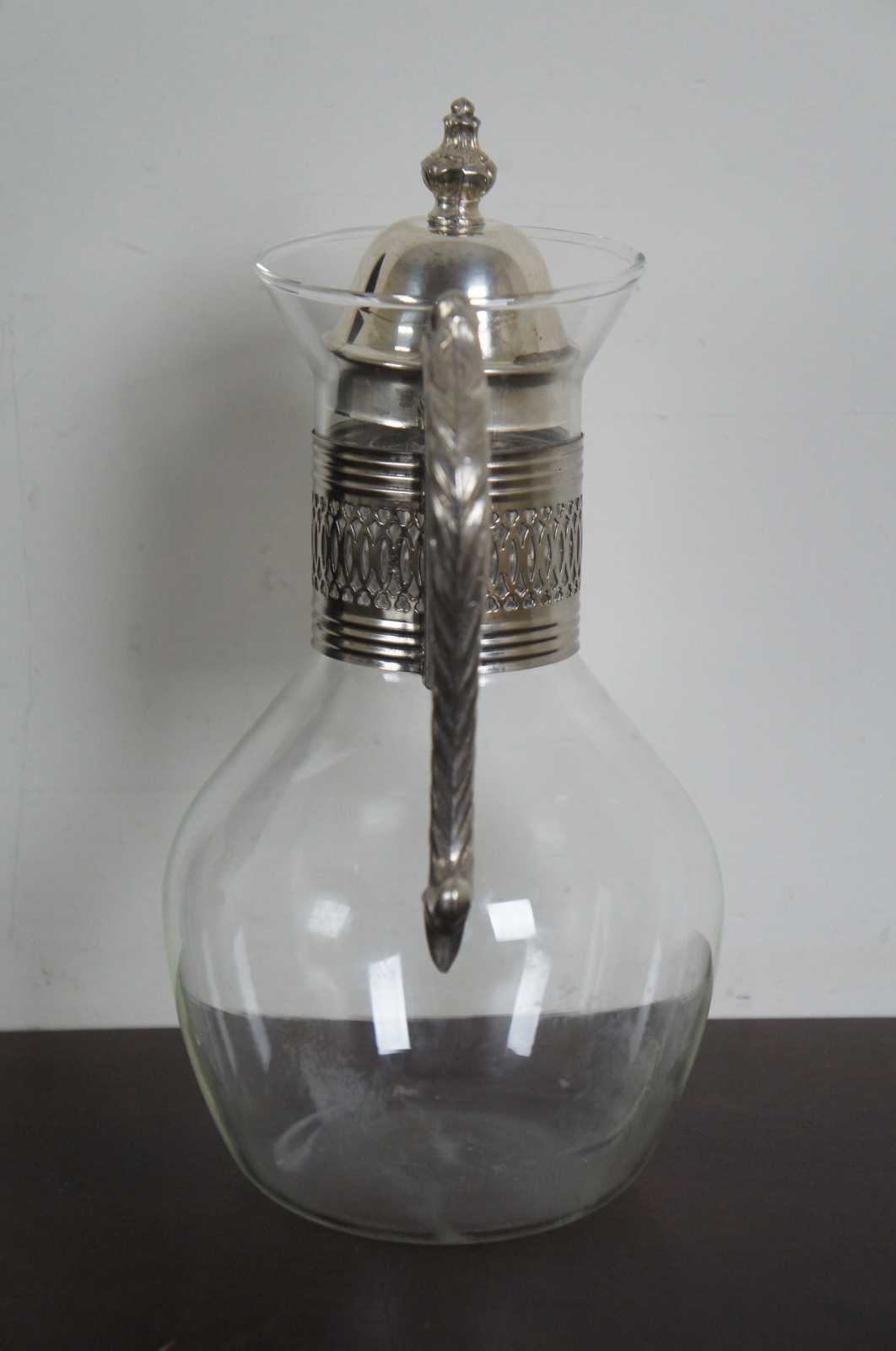 Vintage Corning Brand heat proof glass coffee carafe with silver plate accents, handle, lid and warning stand.