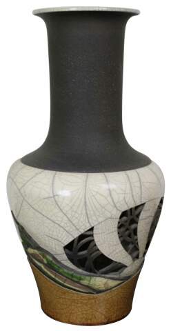 ""Later, color emerged as an important factor with the use of clay colorants mixed with the raku clay body. As science is inseparable from art, I documented each experimental formula until I had achieved a broad spectrum of colors. Using these oxided clays, I have gained control of my medium and can now realize all of the dimensions I visualize.""