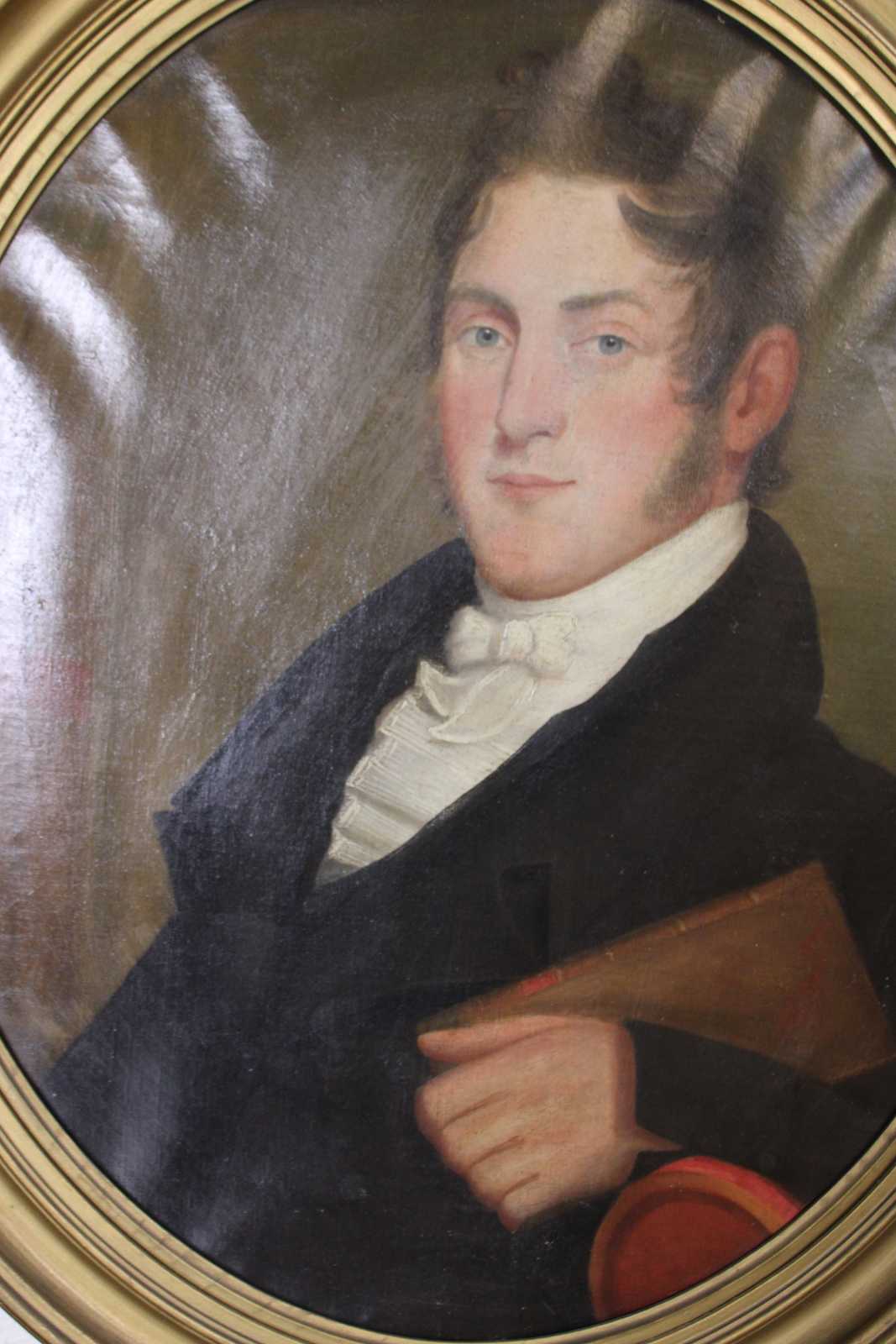 Antique 18th Century oval oil paintings. Features a man and woman (Husband and Wife) dressed in proper attire. Framed in gold.