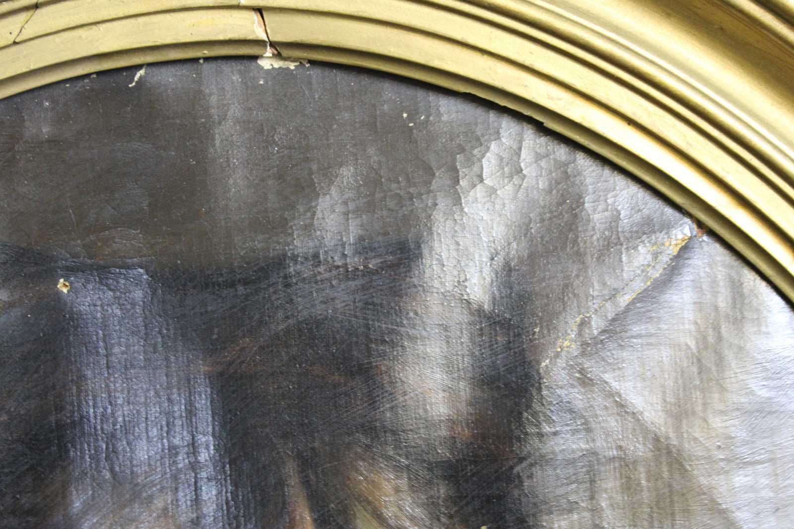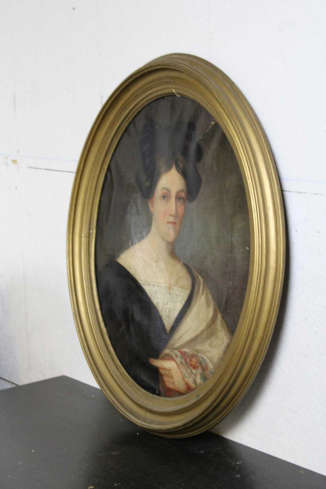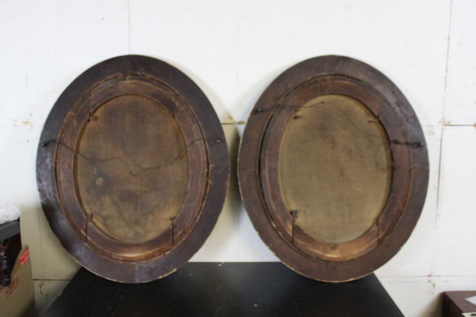 Antique condition, wear and distressing commensurate with age, some waving / creasing / crazing / indents and foxing to canvases, pinhole in woman's hairline, chipping / paint loss to frames, see pictures.