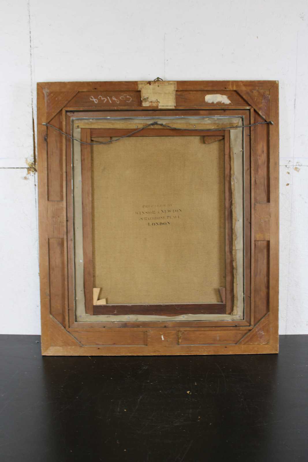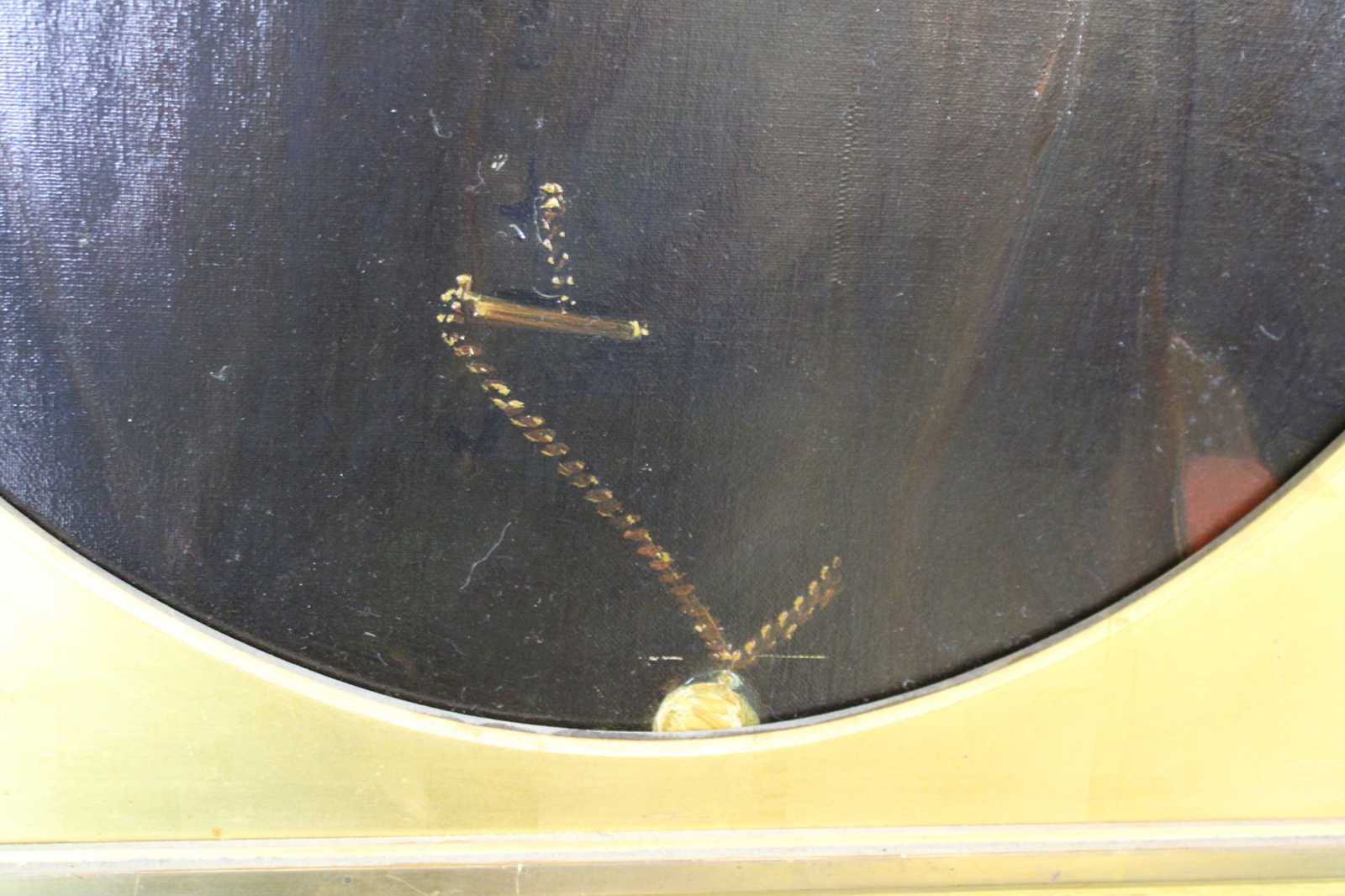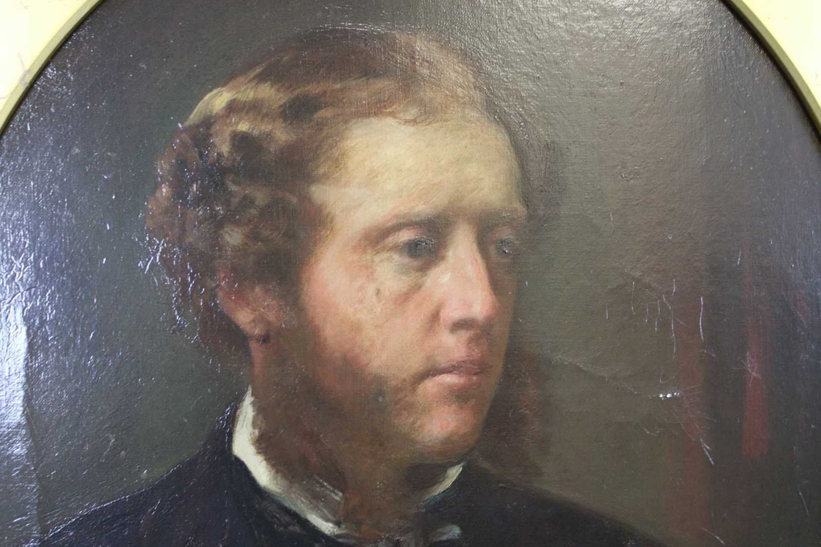 Antique 19th Century portrait oil painting prepared by Winsor Newton. Features a young man dressed in traditional attire with big sideburns, a bowtie and pocket watch. Finished with a gothic inspired gold gilt oval encased frame with rivets.