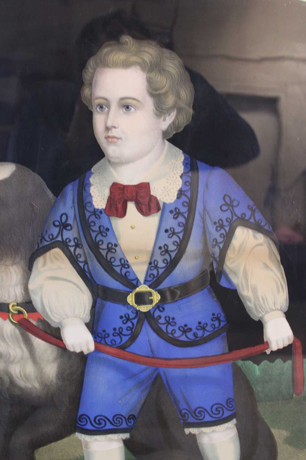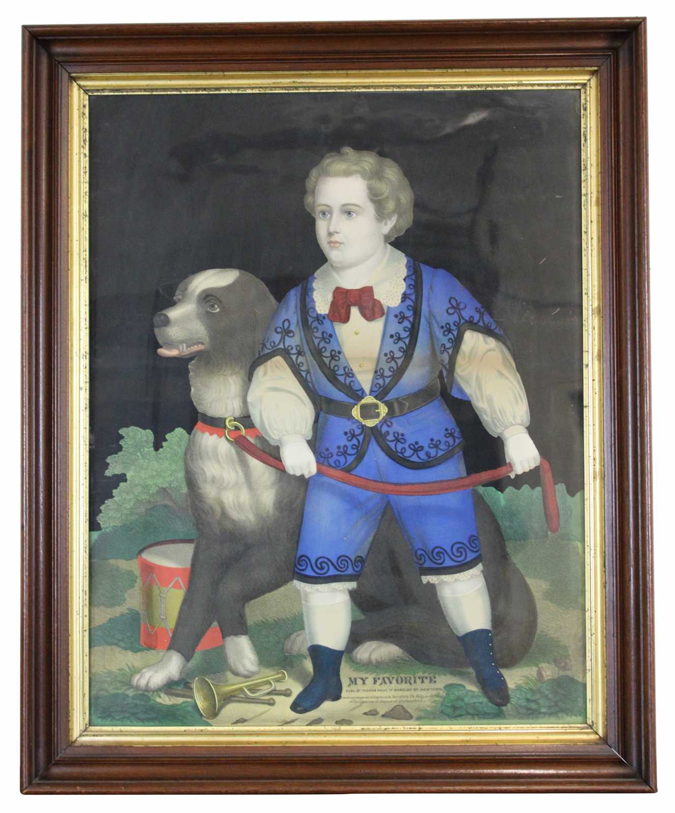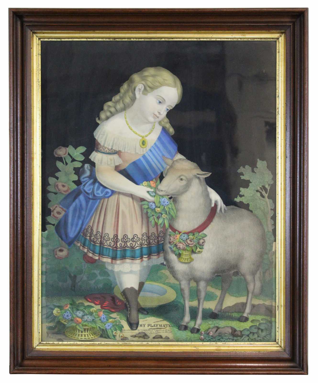 Pair of Antique 1874 Thomas Kelly "My Favorite" and "My Playmate" colored Chromolithographs (lithograph) prints. Features two children, a boy and girl with their pets, a dog (St. Bernard ? / Shepherd ? Karakachan ?) and a Sheep. Both children are dressed in formal attire. Framed in antique gold gilt and mahogany with antique glass.