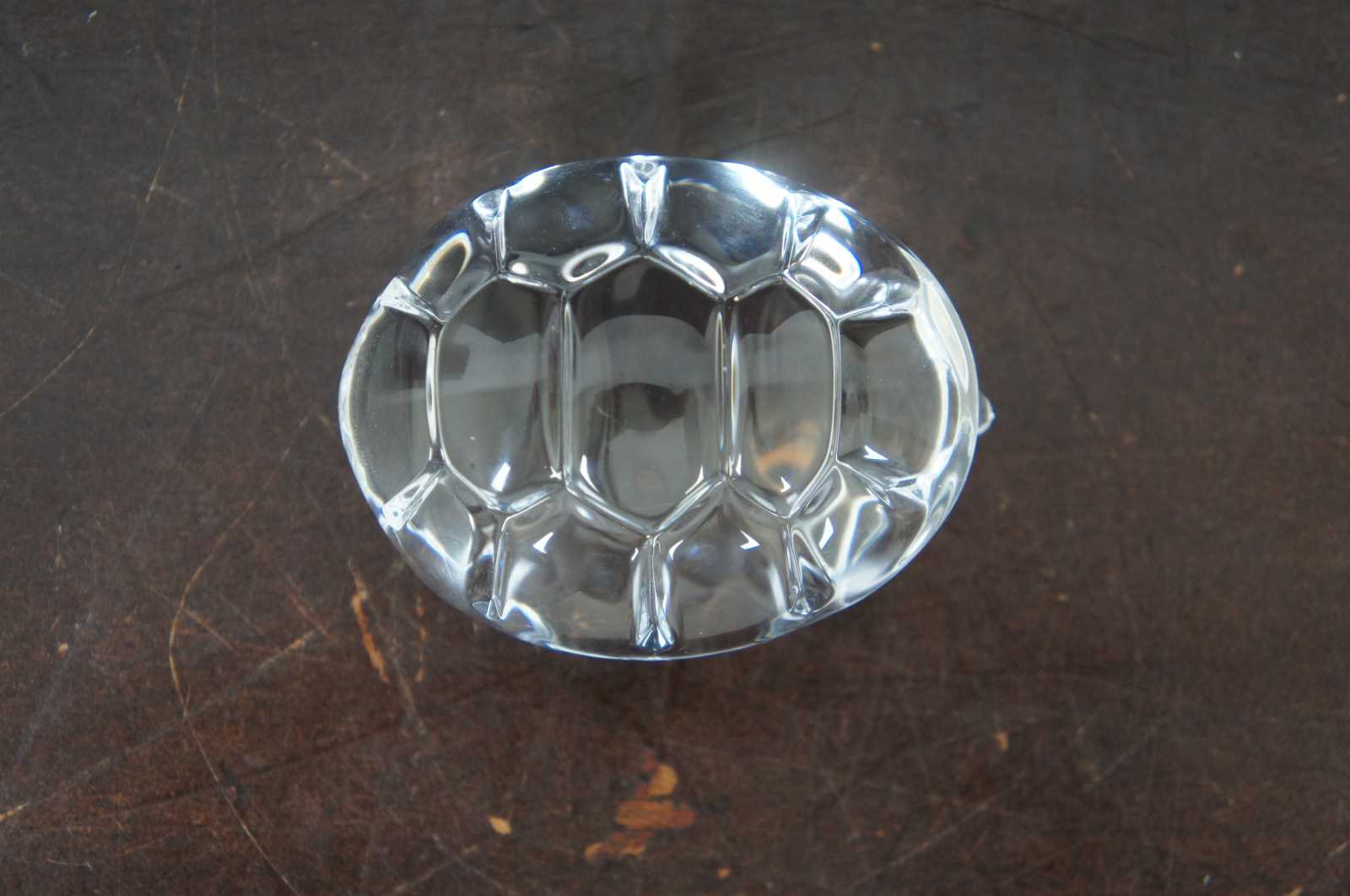 Steuben glass hand cooler in the shape of a turtle tucked into its shell; includes original box.