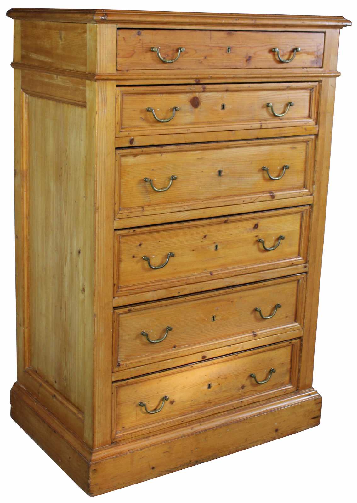 A stunning 19th century English tall chest of drawer or highboy. Made from pine with 6 lockable drawers and French brass hardware.