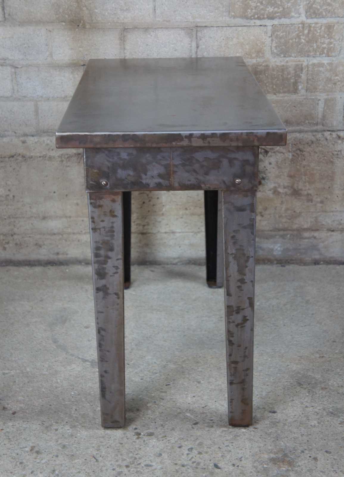 Industrial inspired stainless steel wrapped rectangular form console or sofa table.