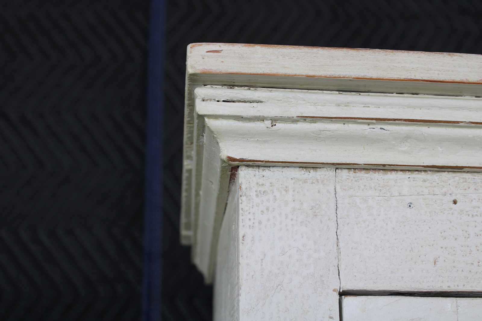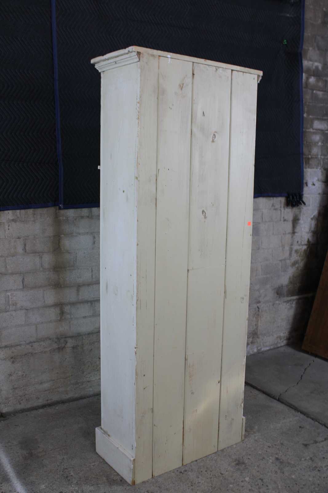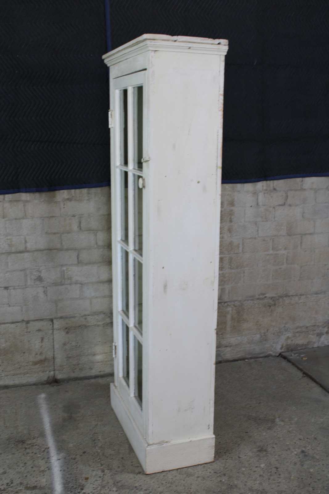 Primitive reclaimed pine country farmhouse cupboard, linen press or cabinet. Features a chic white distressed painted finish and paneled glass doors.